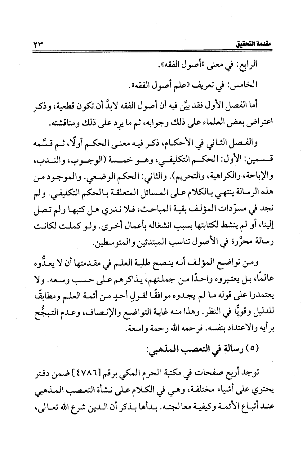 والفصل الثاني في الأحكام، ذكر فيه معنى الحكم أولًا، ثم قسَّمه قسمين: الأول: الحكم التكليفي، وهو خمسة (الوجوب، والندب، والإباحة، والكراهية، والتحريم). والثاني: الحكم الوضعي. والموجود من هذه الرسالة ينتهي بالكلام على المسائل المتعلقة بالحكم التكليفي. ولم نجد في مسوّدات المؤلف بقية المباحث، فلا ندري هل كتبها ولم تصل إلينا، أو لم ينشط لكتابتها بسبب انشغاله بأعمال أخرى. ولو كملت لكانت رسالة محرَّرة في الأصول تناسب المبتدئين والمتوسطين.