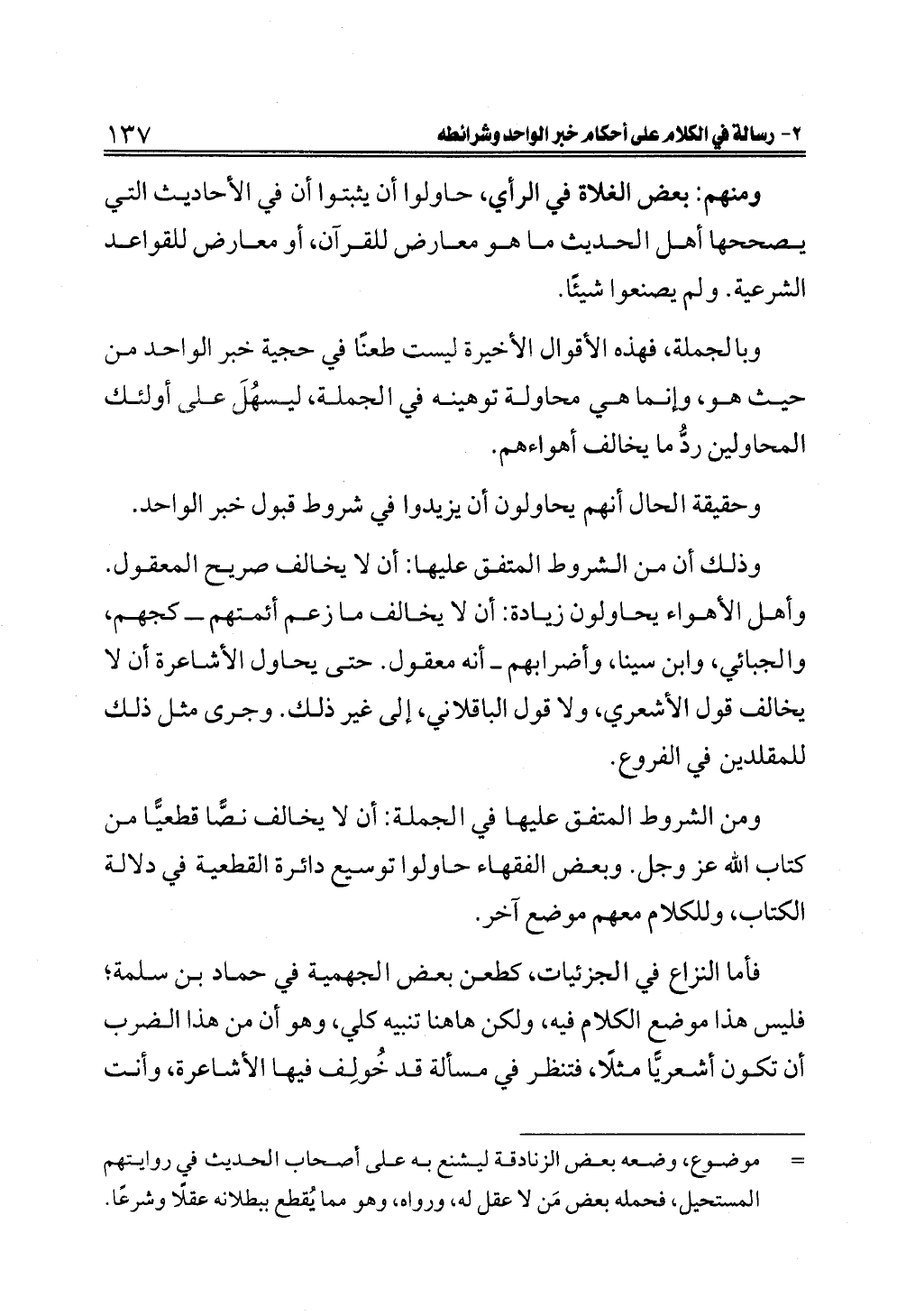 وحقيقة الحال أنهم يحاولون أن يزيدوا في شروط قبول خبر الواحد.