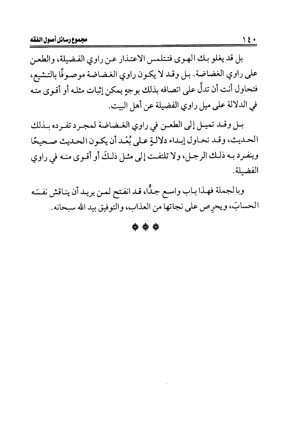بل قد يغلو بك الهوى فتتلمس الاعتذار عن راوي الفضيلة، والطعن على راوي الغضاضة. بل وقد لا يكون راوي الغضاضة موصوفًا بالتشيع، فتحاول أنت أن تدلَّ على اتصافه بذلك بوجهٍ يمكن إثبات مثله أو أقوى منه في الدلالة على ميل راوي الفضيلة عن أهل البيت.