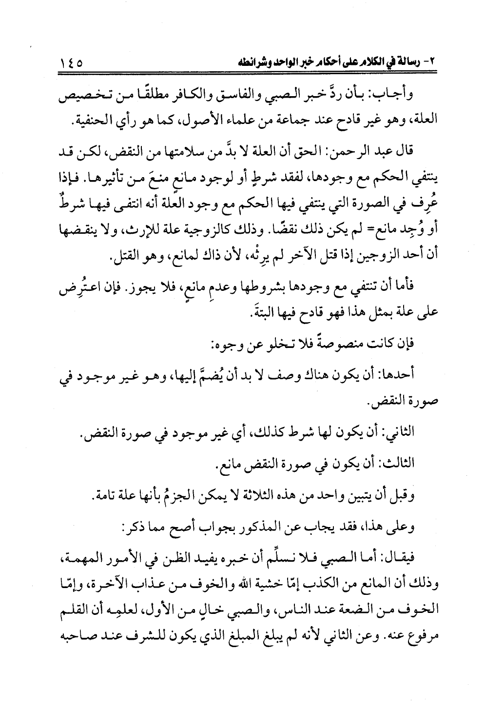 قال عبد الرحمن: الحق أن العلة لا بدَّ من سلامتها من النقض، لكن قد ينتفي الحكم مع وجودها، لفقد شرطٍ أو لوجود مانعٍ منعَ من تأثيرها. فإذا عُرِف في الصورة التي ينتفي فيها الحكم مع وجود العلة أنه انتفى فيها شرطٌ أو وُجِد مانع= لم يكن ذلك نقضًا. وذلك كالزوجية علة للإرث، ولا ينقضها أن أحد الزوجين إذا قتل الآخر لم يرِثْه، لأن ذاك لمانع، وهو القتل.