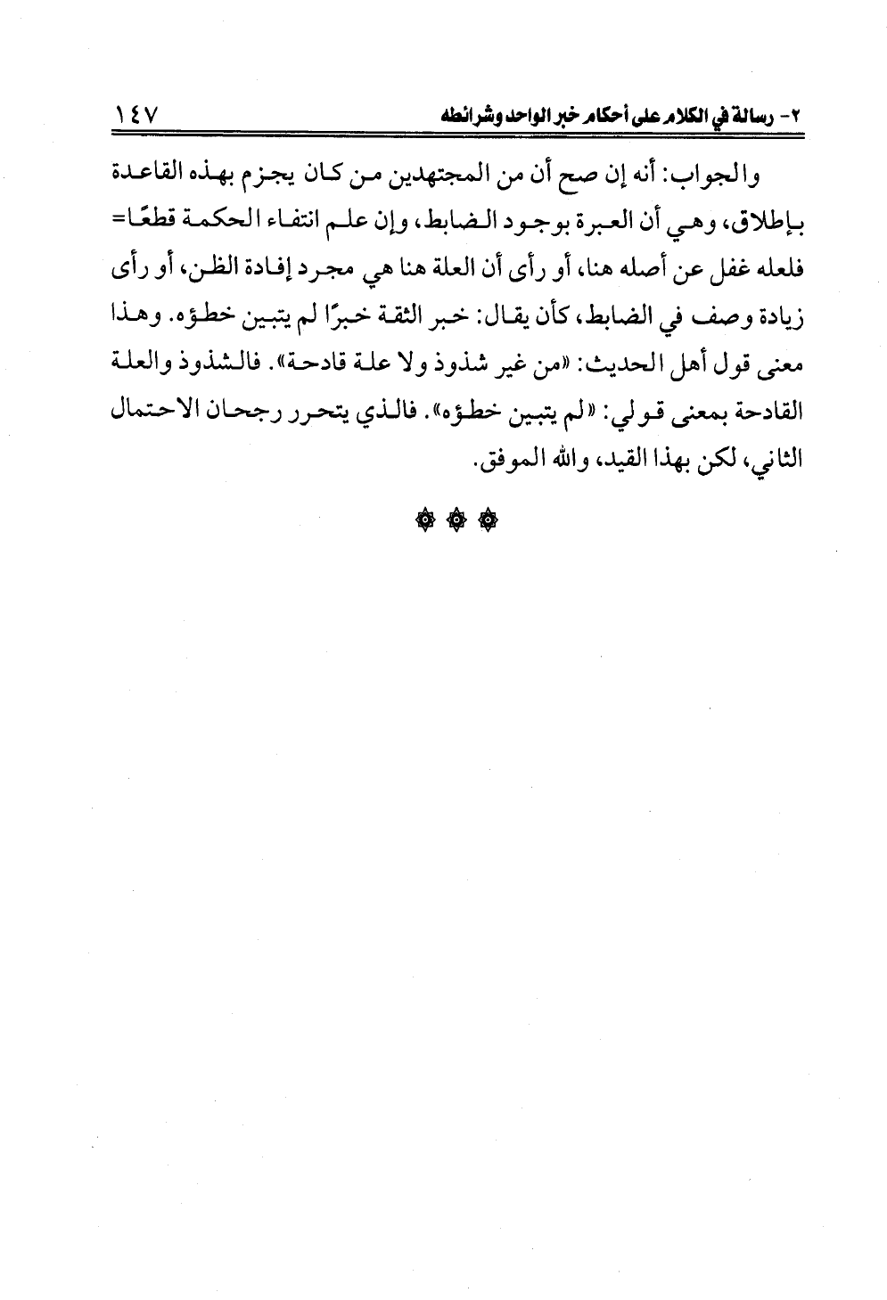 والجواب: أنه إن صح أن من المجتهدين من كان يجزم بهذه القاعدة بإطلاق، وهي أن العبرة بوجود الضابط، وإن علم انتفاء الحكمة قطعًا= فلعله غفل عن أصله هنا، أو رأى أن العلة هنا هي مجرد إفادة الظن، أو رأى زيادة وصف في الضابط، كأن يقال: خبر الثقة خبرًا لم يتبين خطؤه. وهذا معنى قول أهل الحديث: "من غير شذوذ ولا علة قادحة". فالشذوذ والعلة القادحة بمعنى قولي: "لم يتبين خطؤه". فالذي يتحرر رجحان الاحتمال الثاني، لكن بهذا القيد، والله الموفق.