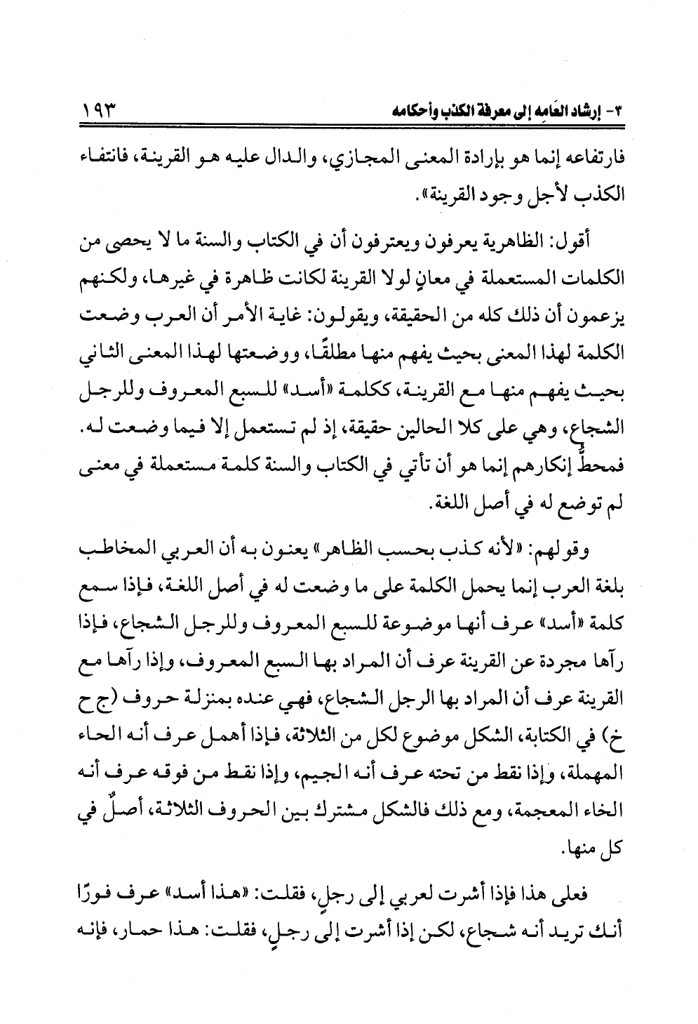 وقولهم: «لأنه كذب بحسب الظاهر» يعنون به أن العربي المخاطب بلغة العرب إنما يحمل الكلمة على ما وضعت له في أصل اللغة، فإذا سمع كلمة «أسد» عرف أنها موضوعة للسبع المعروف وللرجل الشجاع، فإذا رآها مجردة عن القرينة عرف أن المراد بها السبع المعروف، وإذا رآها مع القرينة عرف أن المراد بها الرجل الشجاع، فهي عنده بمنزلة حروف (ج ح خ) في الكتابة، الشكل موضوع لكل من الثلاثة، فإذا أهمل عرف أنه الحاء المهملة، وإذا نقط من تحته عرف أنه الجيم، وإذا نقط من فوقه عرف أنه الخاء المعجمة، ومع ذلك فالشكل مشترك بين الحروف الثلاثة، أصلٌ في كل منها.