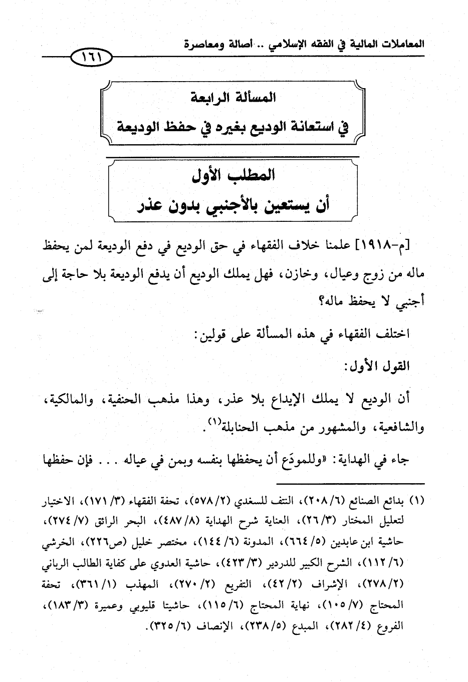 [م - ١٩١٨] علمنا خلاف الفقهاء في حق الوديع في دفع الوديعة لمن يحفظ ماله من زوج وعيال، وخازن، فهل يملك الوديع أن يدفع الوديعة بلا حاجة إلى أجنبي لا يحفظ ماله؟
