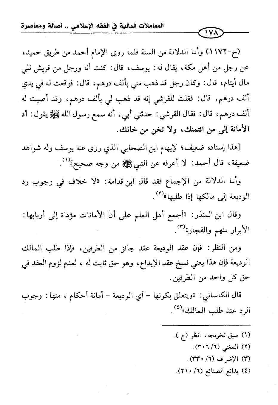 (ح-١١٧٢) وأما الدلالة من السنة فلما روى الإمام أحمد من طريق حميد، عن رجل من أهل مكة، يقال له: يوسف، قال: كنت أنا ورجل من قريش نلي مال أيتام، قال: وكان رجل قد ذهب مني بألف درهم، قال: فوقعت له في يدي ألف درهم، قال: فقلت للقرشي إنه قد ذهب لي بألف درهم، وقد أصبت له ألف درهم، قال: فقال القرشي: حدثني أبي، أنه سمع رسول الله - صلى الله عليه وسلم - يقول: أد الأمانة إلى من ائتمنك، ولا تخن من خانك.