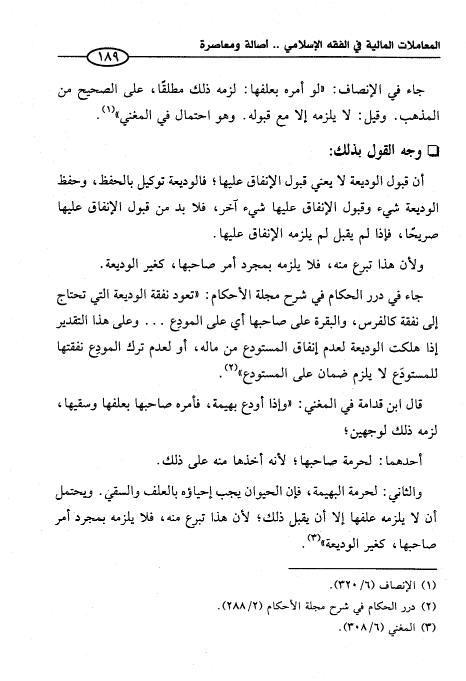 قال ابن قدامة في المغني: "وإذا أودع بهيمة، فأمره صاحبها بعلفها وسقيها، لزمه ذلك لوجهين: