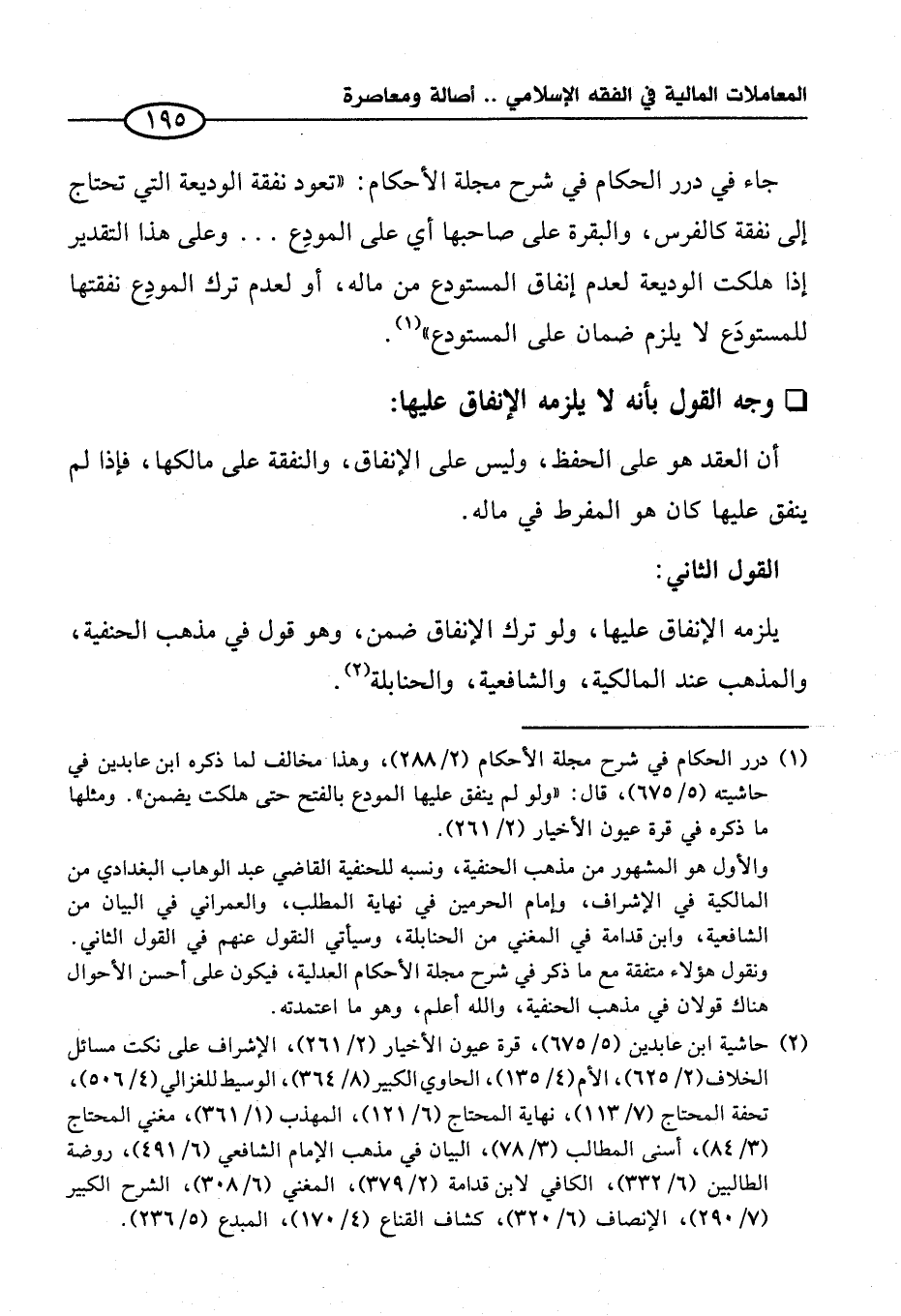 (¬١) درر الحكام في شرح مجلة الأحكام (٢/ ٢٨٨)، وهذا مخالف لما ذكره ابن عابدين في حاشيته (٥/ ٦٧٥)، قال: "ولو لم ينفق عليها المودع بالفتح حتى هلكت يضمن". ومثلها ما ذكره في قرة عيون الأخيار (٢/ ٢٦١).