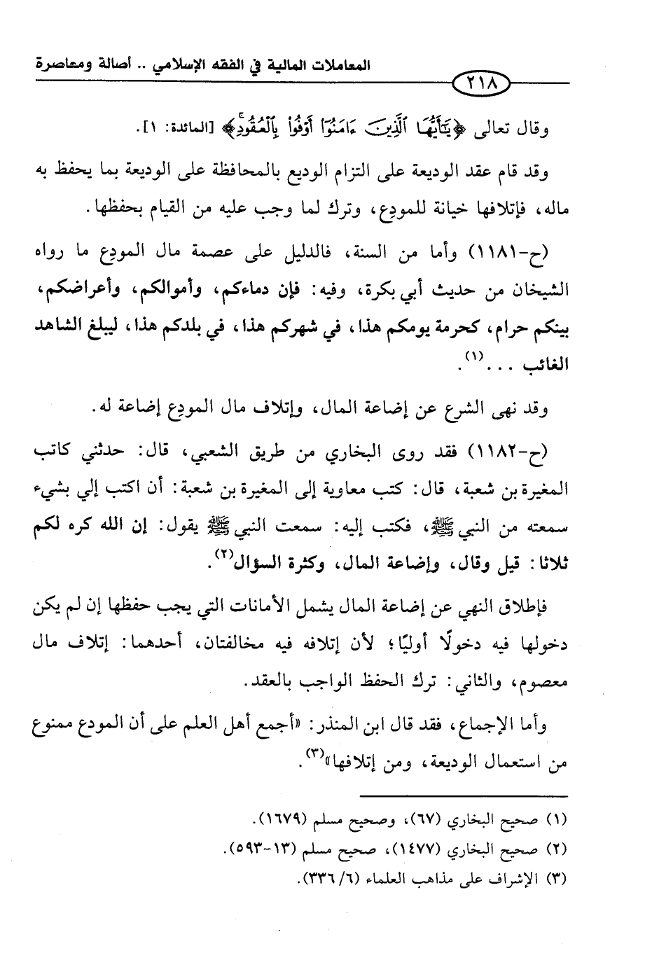 (ح-١١٨١) وأما من السنة، فالدليل على عصمة مال المودِع ما رواه الشيخان من حديث أبي بكرة، وفيه: فإن دماءكم، وأموالكم، وأعراضكم، بينكم حرام، كحرمة يومكم هذا، في شهركم هذا، في بلدكم هذا، ليبلغ الشاهد الغائب ... (¬١).