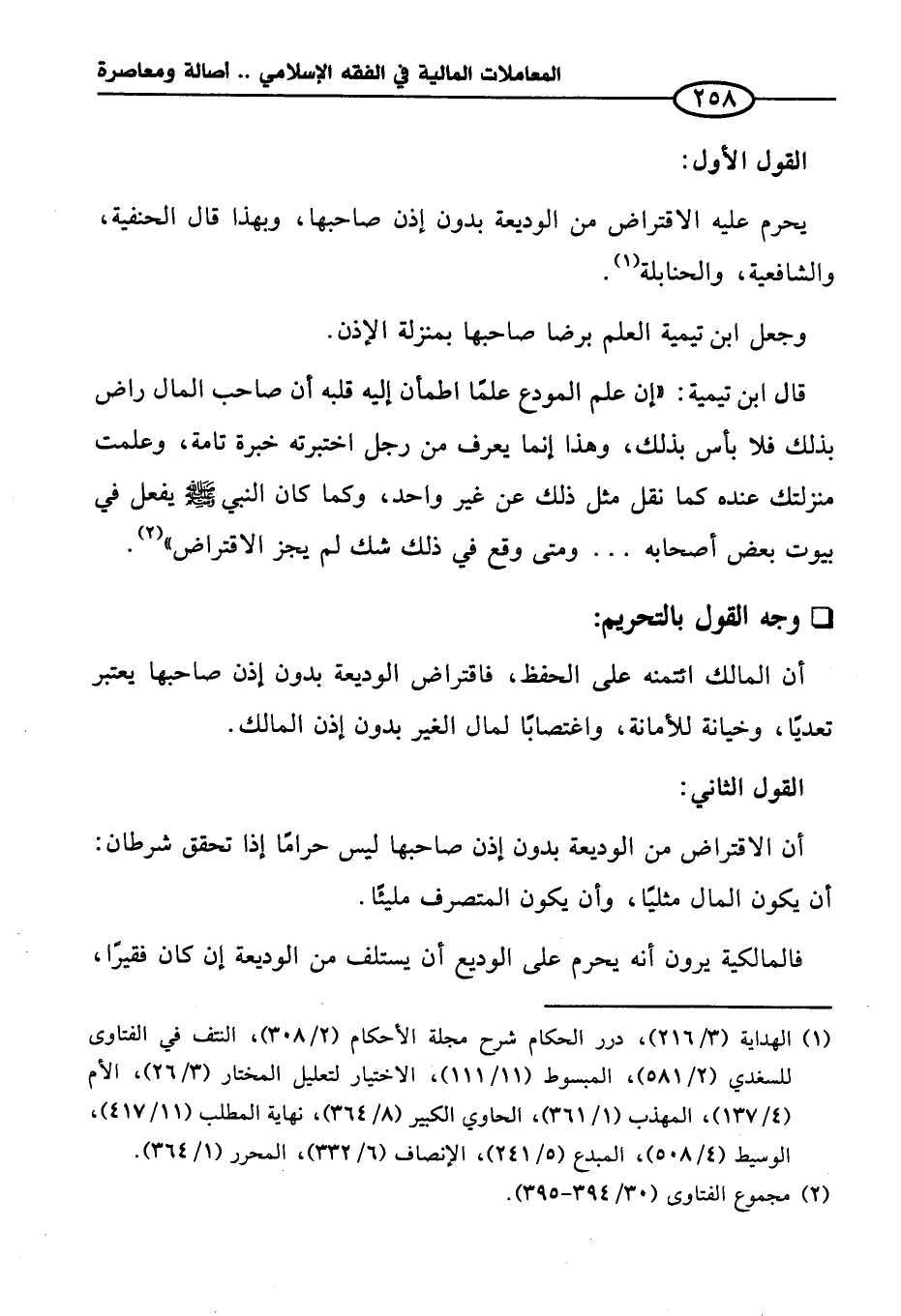 قال ابن تيمية: "إن علم المودع علمًا اطمأن إليه قلبه أن صاحب المال راض بذلك فلا بأس بذلك، وهذا إنما يعرف من رجل اختبرته خبرة تامة، وعلمت منزلتك عنده كما نقل مثل ذلك عن غير واحد، وكما كان النبي - صلى الله عليه وسلم - يفعل في بيوت بعض أصحابه ... ومتى وقع في ذلك شك لم يجز الاقتراض" (¬٢).