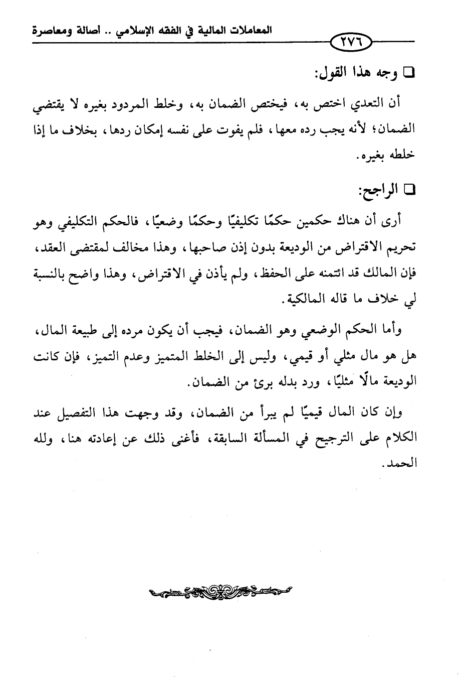 وأما الحكم الوضعي وهو الضمان، فيجب أن يكون مرده إلى طبيعة المال، هل هو مال مثلي أو قيمي، وليس إلى الخلط المتميز وعدم التميز، فإن كانت الوديعة مالًا مثليًّا، ورد بدله بريء من الضمان.