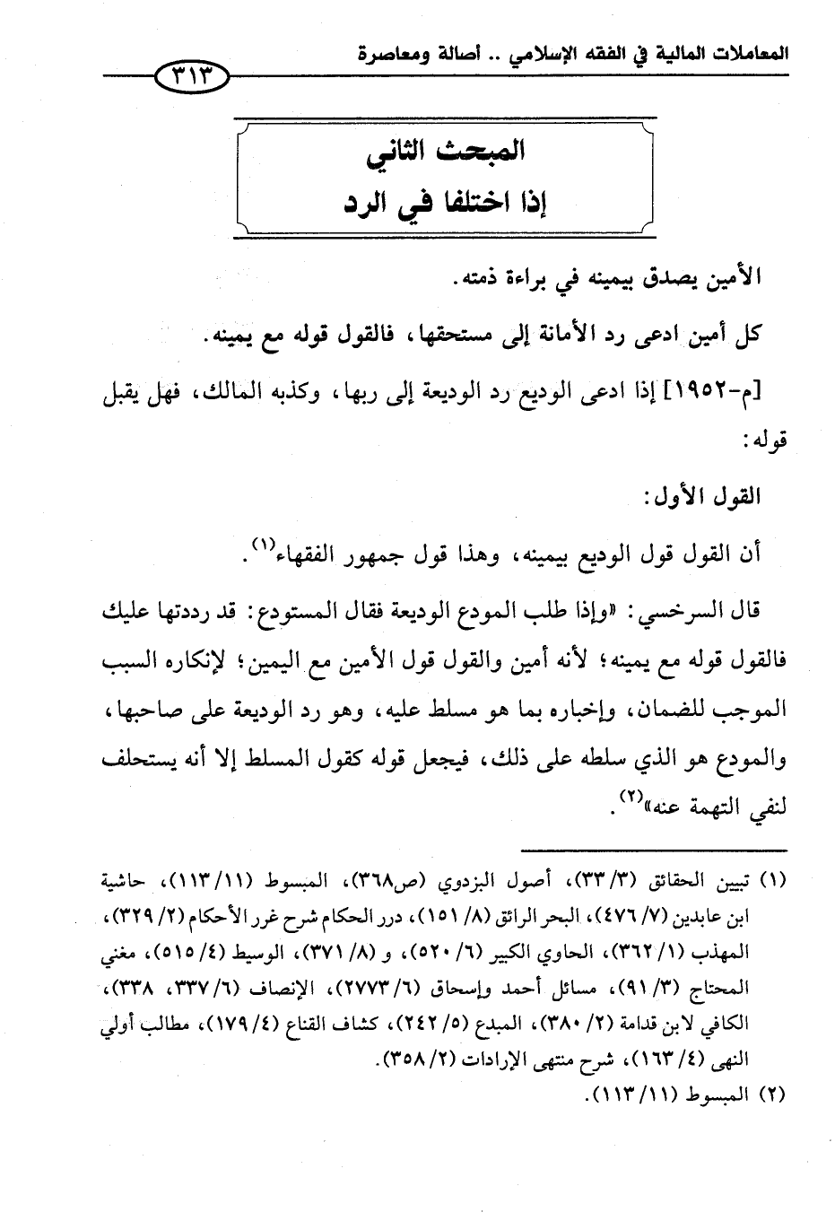 قال السرخسي: "وإذا طلب المودع الوديعة فقال المستودع: قد رددتها عليك فالقول قوله مع يمينه؛ لأنه أمين والقول قول الأمين مع اليمين؛ لإنكاره السبب الموجب للضمان، وإخباره بما هو مسلط عليه، وهو رد الوديعة على صاحبها، والمودع هو الذي سلطه على ذلك، فيجعل قوله كقول المسلط إلا أنه يستحلف لنفي التهمة عنه" (¬٢).