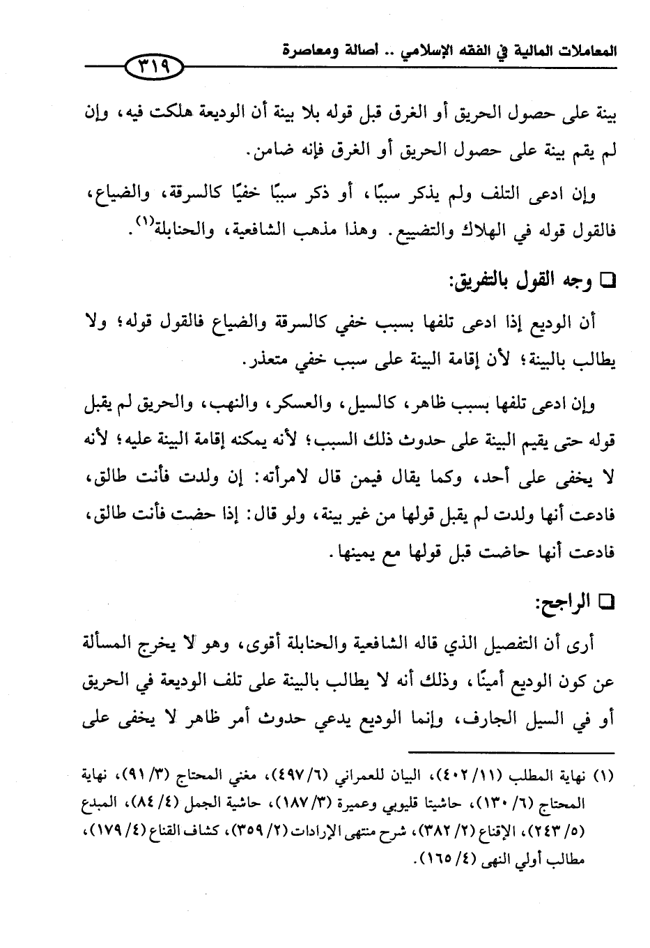 أرى أن التفصيل الذي قاله الشافعية والحنابلة أقوى، وهو ولا يخرج المسألة عن كون الوديع أمينًا، وذلك أنه لا يطالب بالبينة على تلف الوديعة في الحريق أو في السيل الجارف، وإنما الوديع يدعى حدوث أمر ظاهر لا يخفى على
