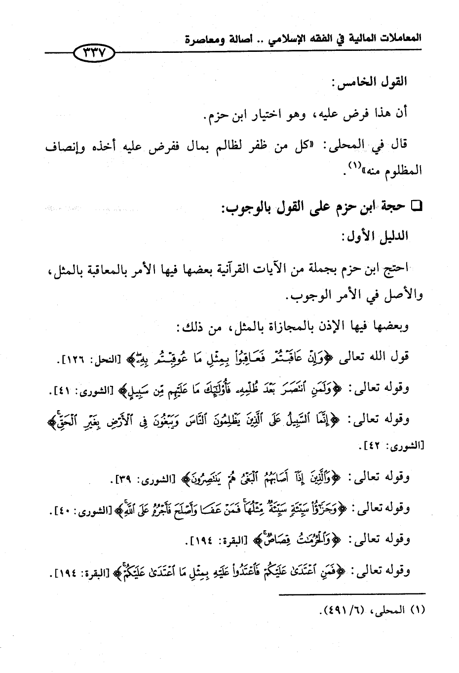 احتج ابن حزم بجملة من الآيات القرآنية بعضها فيها الأمر بالمعاقبة بالمثل، والأصل في الأمر الوجوب.