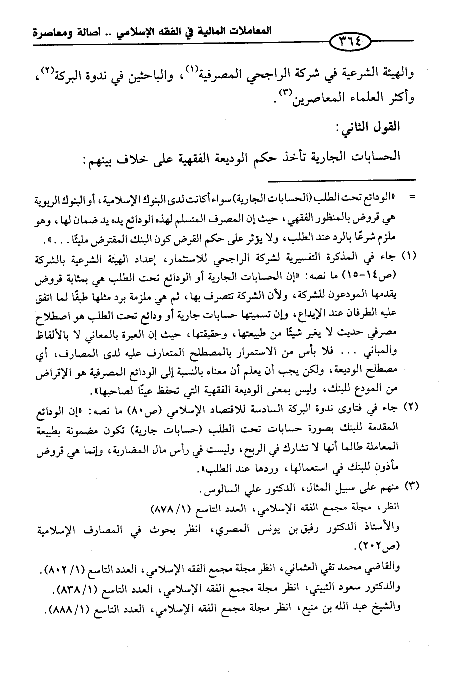 (¬١) جاء في المذكرة التفسيرية لشركة الراجحي للاستثمار، إعداد الهيئة الشرعية بالشركة (ص١٤ - ١٥) ما نصه: "إن الحسابات الجارية أو الودائع تحت الطلب هي بمثابة قروض يقدمها المودعون للشركة، ولأن الشركة تتصرف بها، ثم هي ملزمة برد مثلها طبقًا لما اتفق عليه الطرفان عند الإيداع، وإن تسميتها حسابات جارية أو ودائع تحت الطلب هو اصطلاح مصرفي حديث لا يغير شيئًا من طبيعتها، وحقيقتها، حيث إن العبرة بالمعاني لا بالألفاظ والمباني ... فلا بأس من الاستمرار بالمصطلح المتعارف عليه لدى المصارف، أي مصطلح الوديعة، ولكن يجب أن يعلم أن معناه بالنسبة إلى الودائع المصرفية هو الإقراض من المودع للبنك، وليس بمعنى الوديعة الفقهية التي تحفظ عينًا لصاحبها".