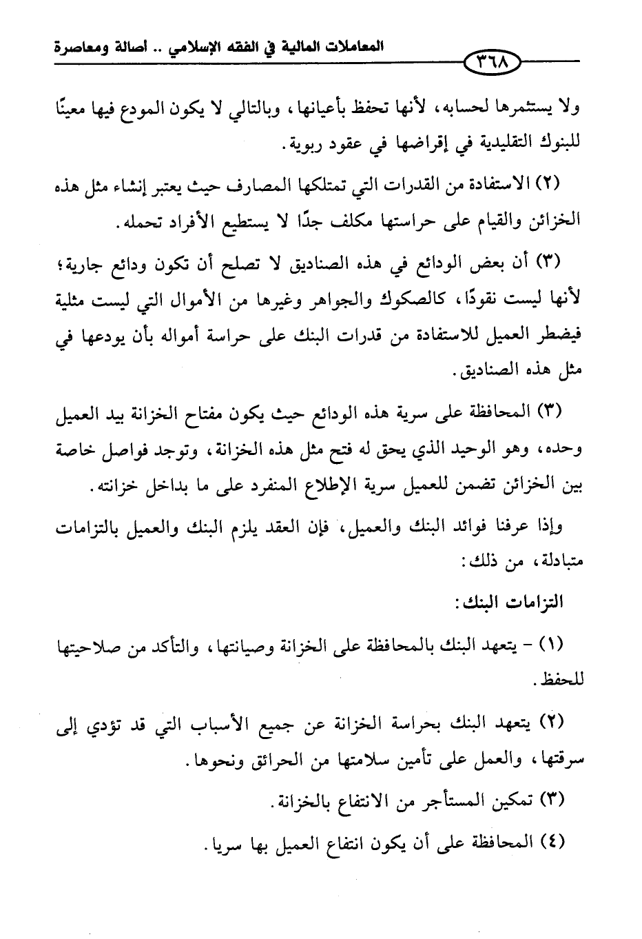 ولا يستثمرها لحسابه, لأنها تحفظ بأعيانها، وبالتالي لا يكون المودع فيها معينًا للبنوك التقليدية في إقراضها في عقود ربوية.