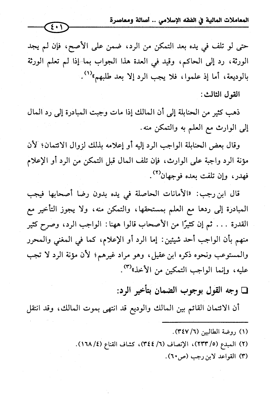 وقال بعض الحنابلة الواجب الرد إليه أو إعلامه بذلك لزوال الائتمان؛ لأن مؤنة الرد واجبة على الوارث، فإن تلف المال قبل التمكن من الرد أو الإعلام فهدر، وإن تلفت بعده فوجهان (¬٢).