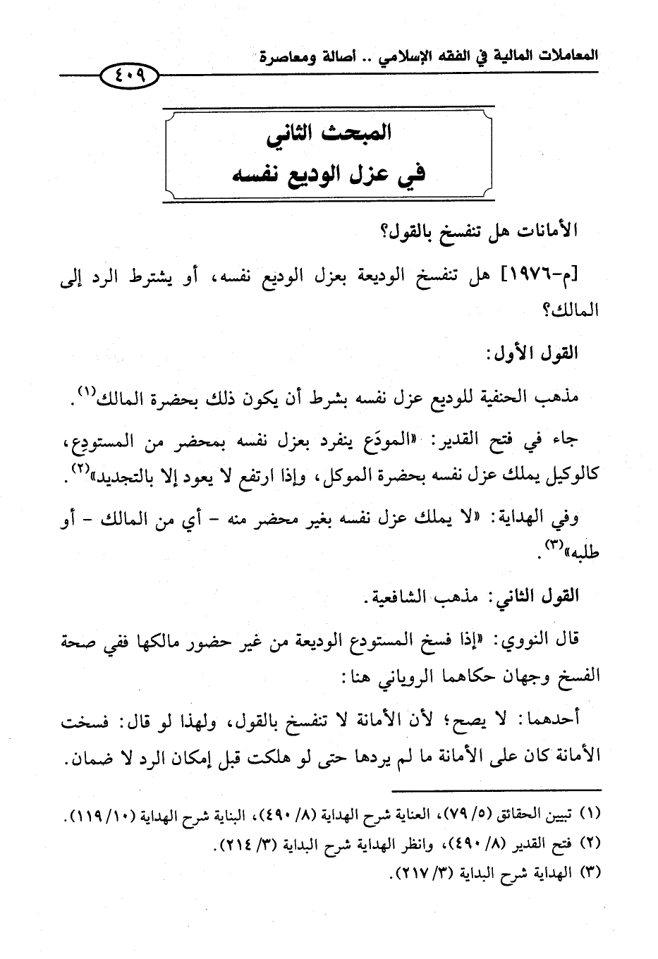 [م - ١٩٧٦] هل تنفسخ الوديعة بعزل الوديع نفسه، أو يشترط الرد إلى المالك؟