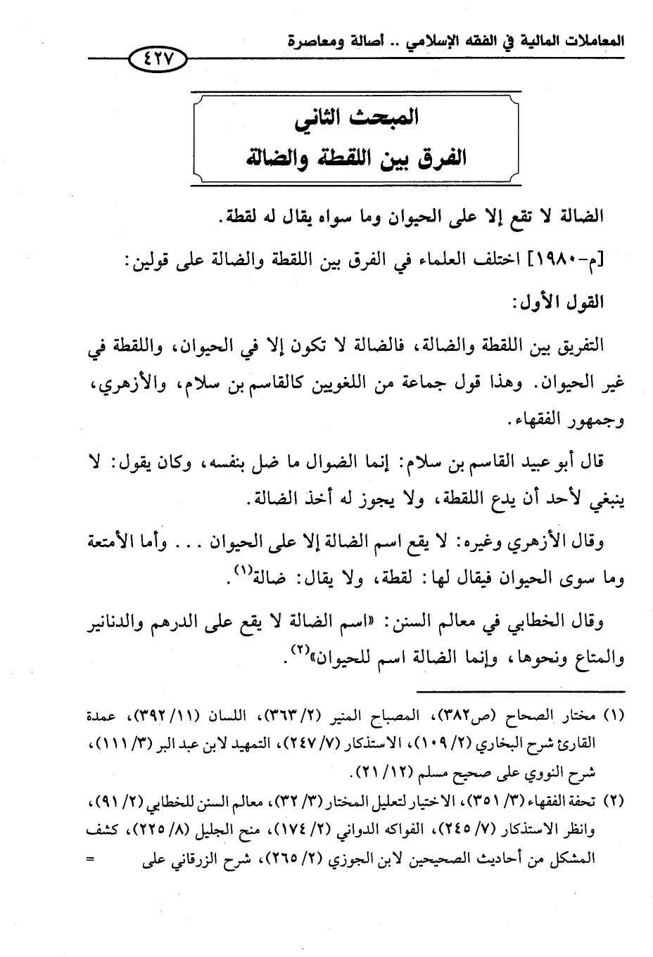 التفريق بين اللقطة والضالة، فالضالة لا تكون إلا في الحيوان، واللقطة في غير الحيوان. وهذا قول جماعة من اللغويين كالقاسم بن سلام، والأزهري، وجمهور الفقهاء.