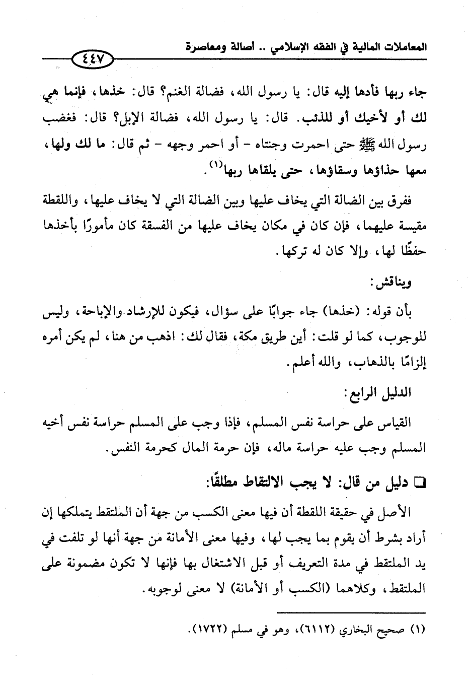 جاء ربها فأدها إليه قال: يا رسول الله، فضالة الغنم؟ قال: خذها، فإنما هي لك أو لأخيك أو للذئب. قال: يا رسول الله، فضالة الإبل؟ قال: فغضب رسول الله - صلى الله عليه وسلم - حتى احمرت وجنتاه -أو احمر وجهه- ثم قال: ما لك ولها، معها حذاؤها وسقاؤها، حتى يلقاها ربها (¬١).