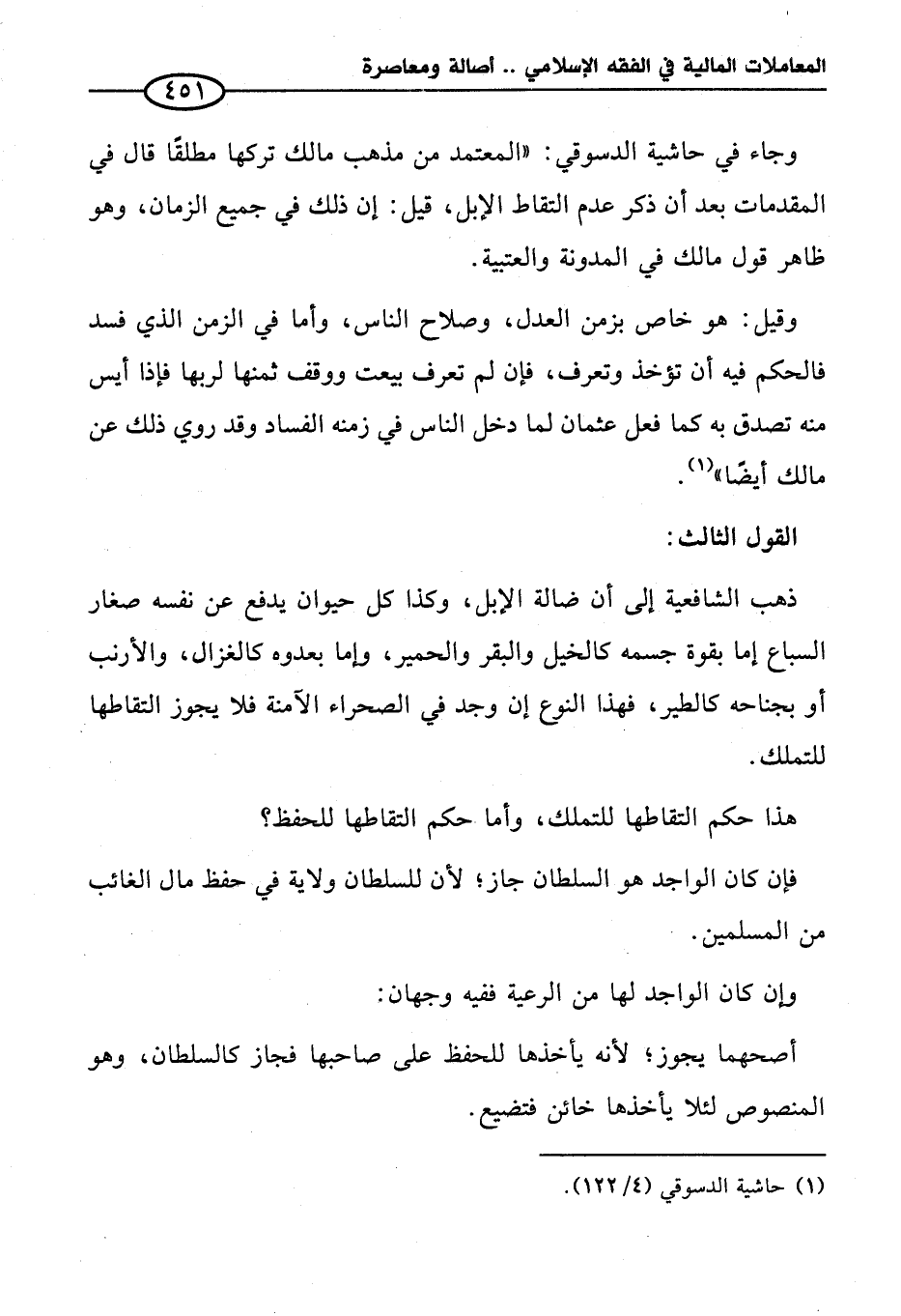 وجاء في حاشية الدسوقي: "المعتمد من مذهب مالك تركها مطلقًا قال في المقدمات بعد أن ذكر عدم التقاط الإبل، قيل: إن ذلك في جميع الزمان، وهو ظاهر قول مالك في المدونة والعتبية.