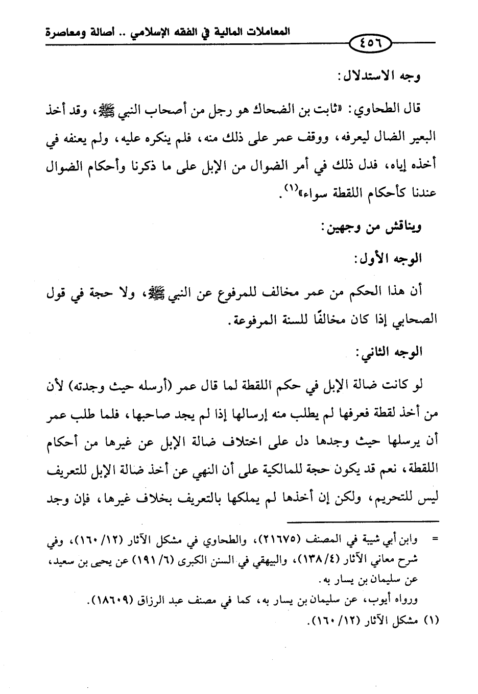 قال الطحاوي: "ثابت بن الضحاك هو رجل من أصحاب النبي - صلى الله عليه وسلم -، وقد أخذ البعير الضال ليعرفه، ووقف عمر على ذلك منه، فلم ينكره عليه، ولم يعنفه في أخذه إياه، فدل ذلك في أمر الضوال من الإبل على ما ذكرنا وأحكام الضوال عندنا كأحكام اللقطة سواء" (¬١).