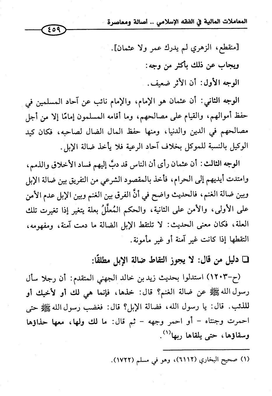 (ح - ١٢٠٣) استدلوا بحديث زيد بن خالد الجهني المتقدم: أن رجلا سأل رسول الله - صلى الله عليه وسلم - عن ضالة الغنم؟ قال: خذها، فإنما هي لك أو لأخيك أو للذئب. قال: يا رسول الله، فضالة الإبل؟ قال: فغضب رسول الله - صلى الله عليه وسلم - حتى احمرت وجنتاه -أو احمر وجهه- ثم قال: ما لك ولها، معها حذاؤها وسقاؤها، حتى يلقاها ربها (¬١).