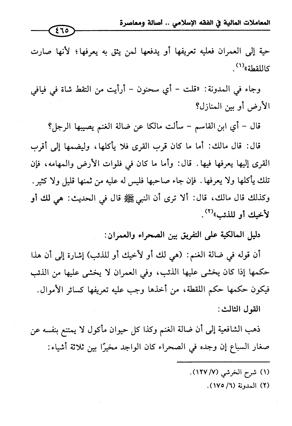وجاء في المدونة: "قلت -أي سحنون- أرأيت من التقط شاة في فيافي الأرض أو بين المنازل؟