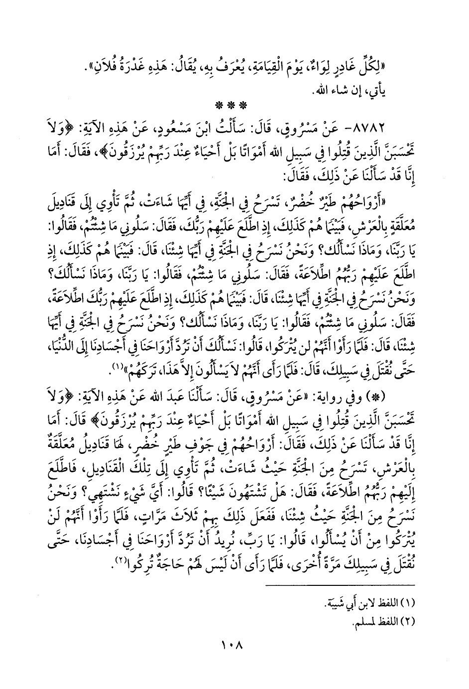 - وفي رواية: «عن مسروق، قال: سألنا عبد الله عن هذه الآية: {ولا تحسبن الذين قتلوا في سبيل الله أمواتا بل أحياء عند ربهم يرزقون} قال: أما إنا قد سألنا عن ذلك، فقال: أرواحهم في جوف طير خضر، لها قناديل معلقة بالعرش، تسرح من الجنة حيث شاءت، ثم تأوي إلى تلك القناديل، فاطلع إليهم ربهم اطلاعة، فقال: هل تشتهون شيئا؟ قالوا: أي شيء نشتهي؟ ونحن نسرح من الجنة حيث شئنا، ففعل ذلك بهم ثلاث مرات، فلما رأوا أنهم لن يتركوا من أن يسألوا، قالوا: يا رب، نريد أن ترد أرواحنا في أجسادنا، حتى نقتل في سبيلك مرة أخرى، فلما رأى أن ليس لهم حاجة تركوا (¬٢).