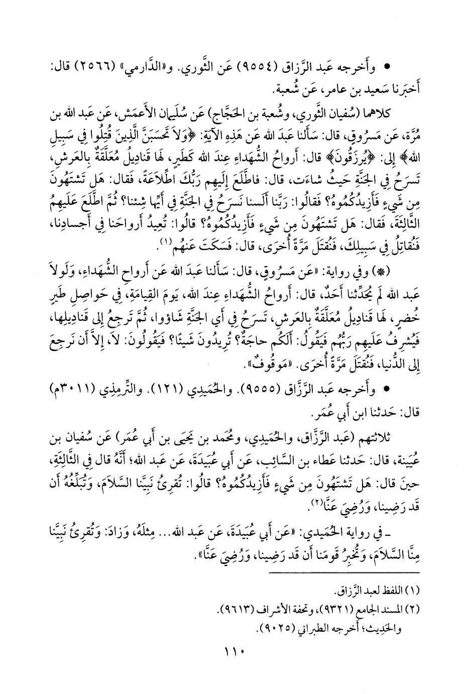- وفي رواية: «عن مسروق، قال: سألنا عبد الله عن أرواح الشهداء، ولولا عبد الله لم يحدثنا أحد، قال: أرواح الشهداء عند الله، يوم القيامة، في حواصل طير خضر، لها قناديل معلقة بالعرش، تسرح في أي الجنة شاؤوا، ثم ترجع إلى قناديلها، فيشرف عليهم ربهم فيقول: ألكم حاجة؟ تريدون شيئا؟ فيقولون: لا، إلا أن نرجع إلى الدنيا، فنقتل مرة أخرى. «موقوف».