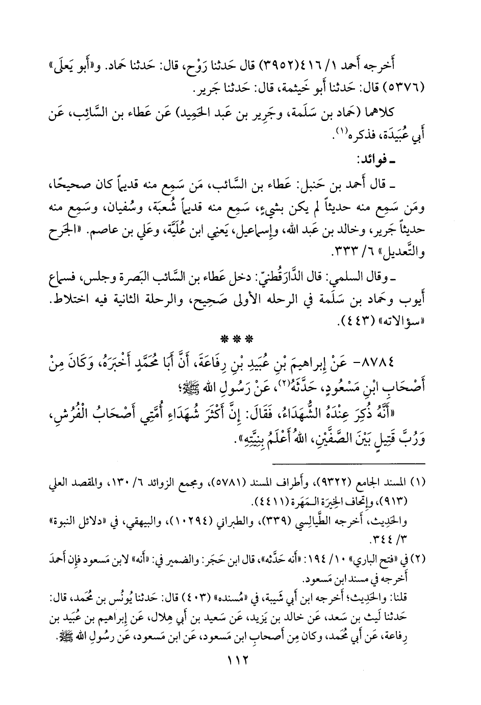 قلنا: والحديث؛ أخرجه ابن أبي شيبة في «مسنده» (٤٠٣) قال: حدثنا يونس بن محمد، قال: حدثنا ليث بن سعد، عن خالد بن يزيد، عن سعيد بن أبي هلال، عن إبراهيم بن عبيد بن رفاعة، عن أبي محمد، وكان من أصحاب ابن مسعود، عن ابن مسعود، عن رسول الله صَلى الله عَليه وسَلم.