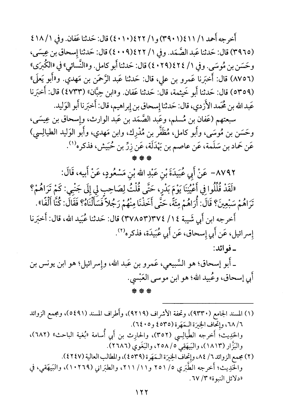 (¬١) المسند الجامع (٩٣٣٠)، وتحفة الأشراف (٩٢١٩)، وأطراف المسند (٥٤٩١)، ومَجمَع الزوائد ٦/ ٦٨، وإتحاف الخِيرَة المَهَرة (٤٥٣٥ و ٦٤٠٥).