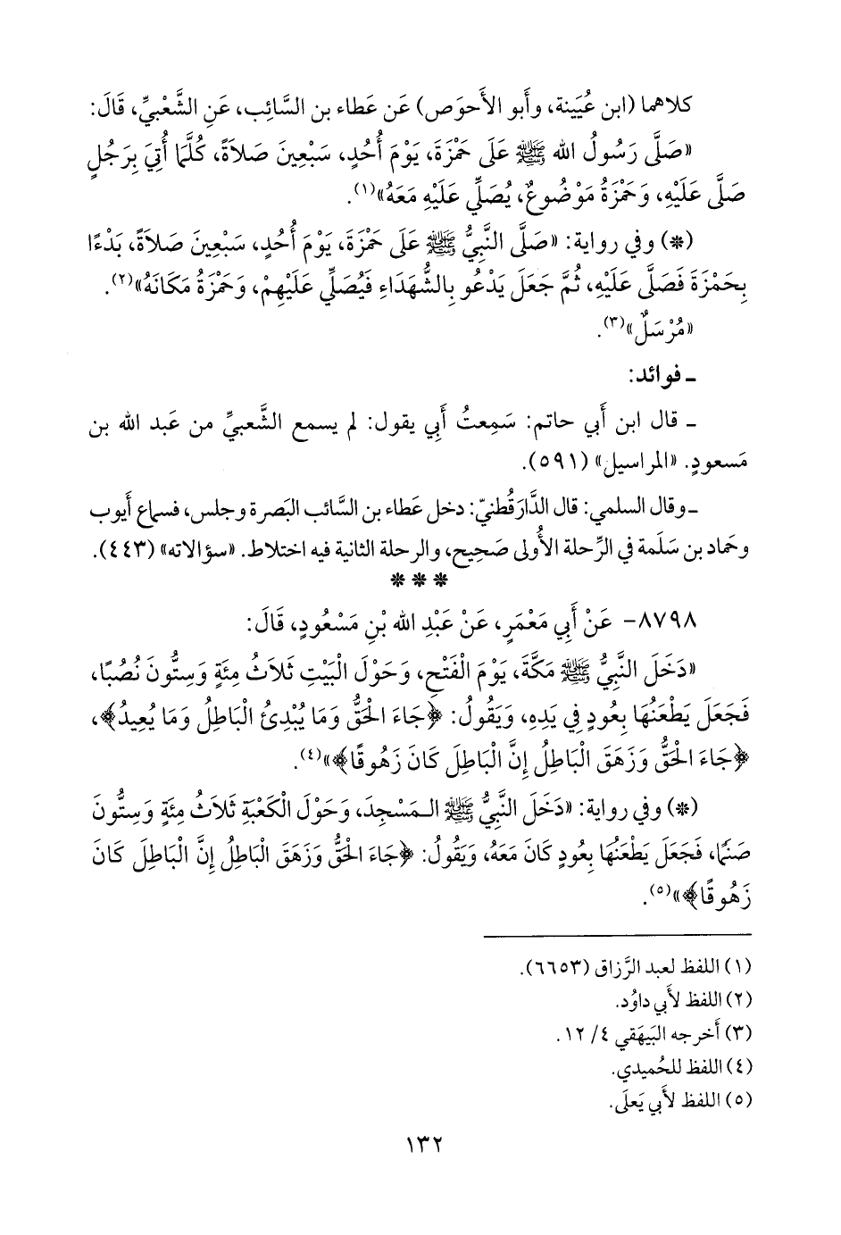 «دخل النبي صَلى الله عَليه وسَلم مكة، يوم الفتح، وحول البيت ثلاث مئة وستون نصبا، فجعل يطعنها بعود في يده، ويقول: {جاء الحق وما يبدئ الباطل وما يعيد}، {جاء الحق وزهق الباطل إن الباطل كان زهوقا}» (¬١).