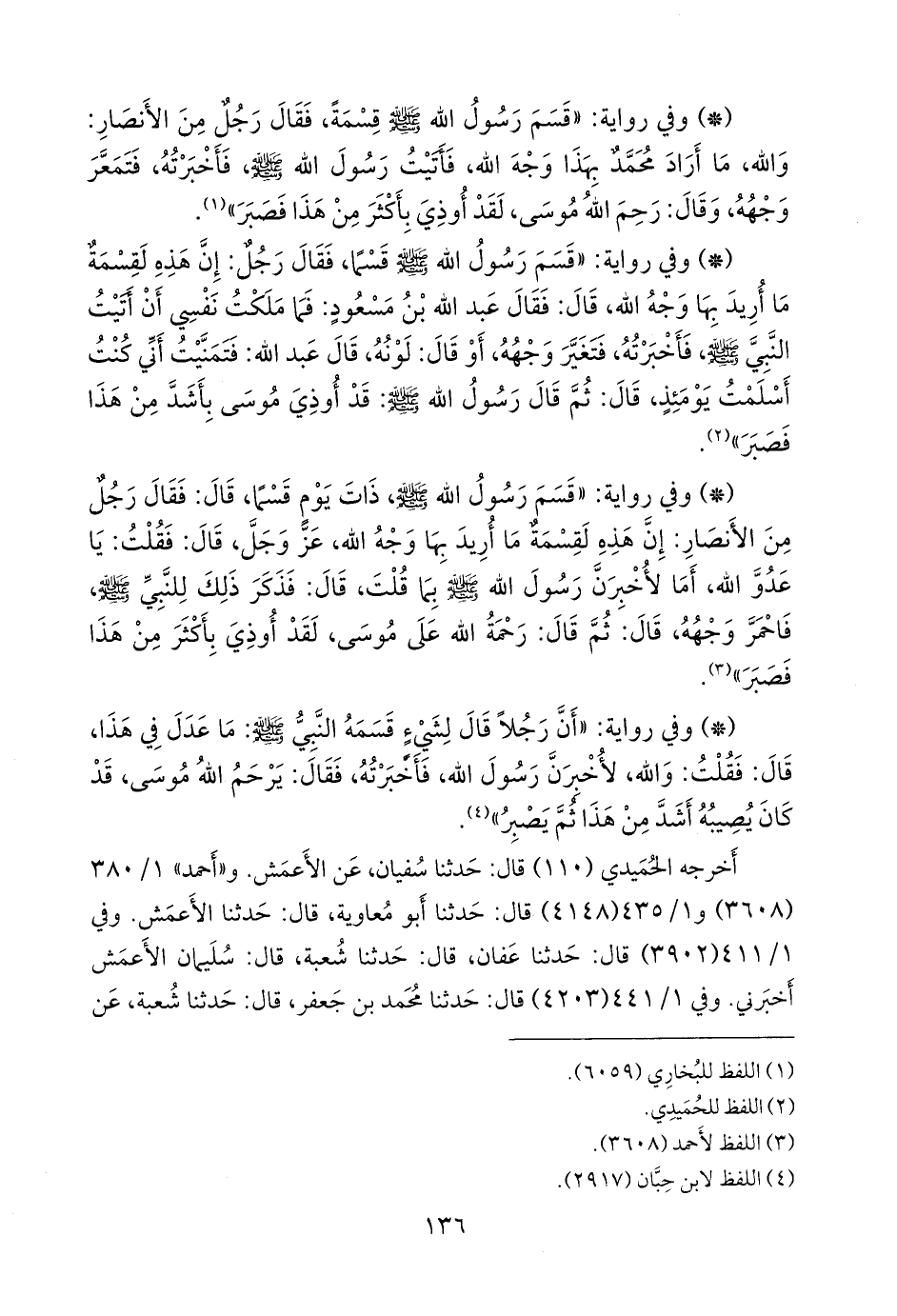 - وفي رواية: «قسم رسول الله صَلى الله عَليه وسَلم قسما، فقال رجل: إن هذه لقسمة ما أريد بها وجه الله، قال: فقال عبد الله بن مسعود: فما ملكت نفسي أن أتيت النبي صَلى الله عَليه وسَلم فأخبرته، فتغير وجهه، أو قال: لونه، قال عبد الله: فتمنيت أني كنت أسلمت يومئذ، قال: ثم قال رسول الله صَلى الله عَليه وسَلم: قد أوذي موسى بأشد من هذا فصبر» (¬١).
