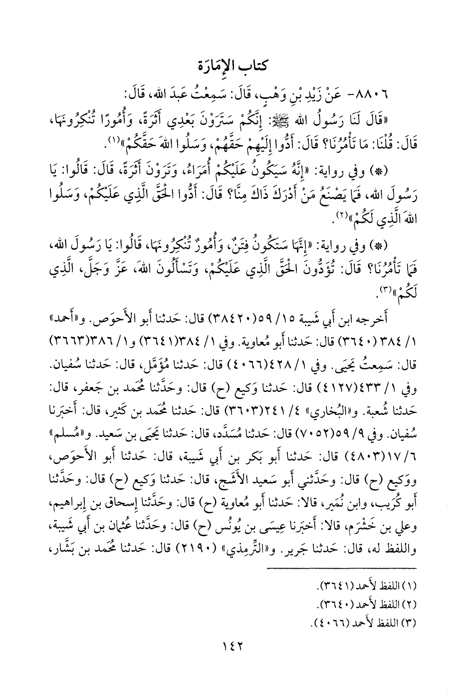 - وفي رواية: «إنها ستكون فتن، وأمور تنكرونها، قالوا: يا رسول الله، فما تأمرنا؟ قال: تؤدون الحق الذي عليكم، وتسألون الله، عز وجل، الذي لكم» (¬٣).