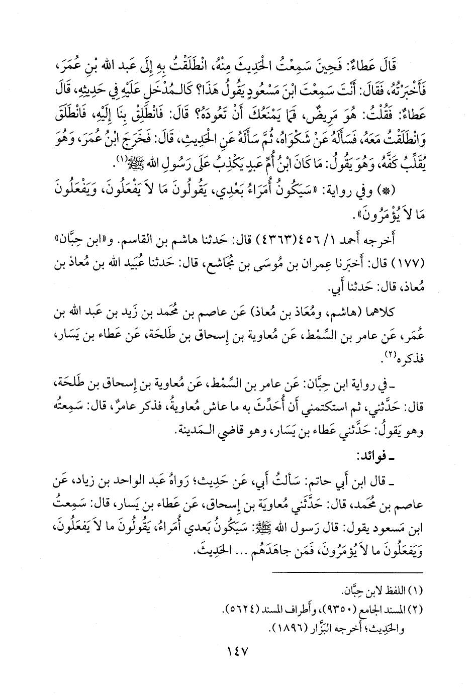 - قال عبد الرَّحمَن بن أبي حاتم الرازي: سألت أبي، عن حديث؛ رواه عبد الواحد بن زياد، عن عاصم بن محمد، قال: حدثني معاوية بن إسحاق، عن عطاء بن يسار، قال: سمعت ابن مسعود يقول: قال رسول الله صَلى الله عَليه وسَلم: سيكون بعدي أمراء، يقولون ما لا يفعلون، ويفعلون ما لا يؤمرون، فمن جاهدهم، الحديث.