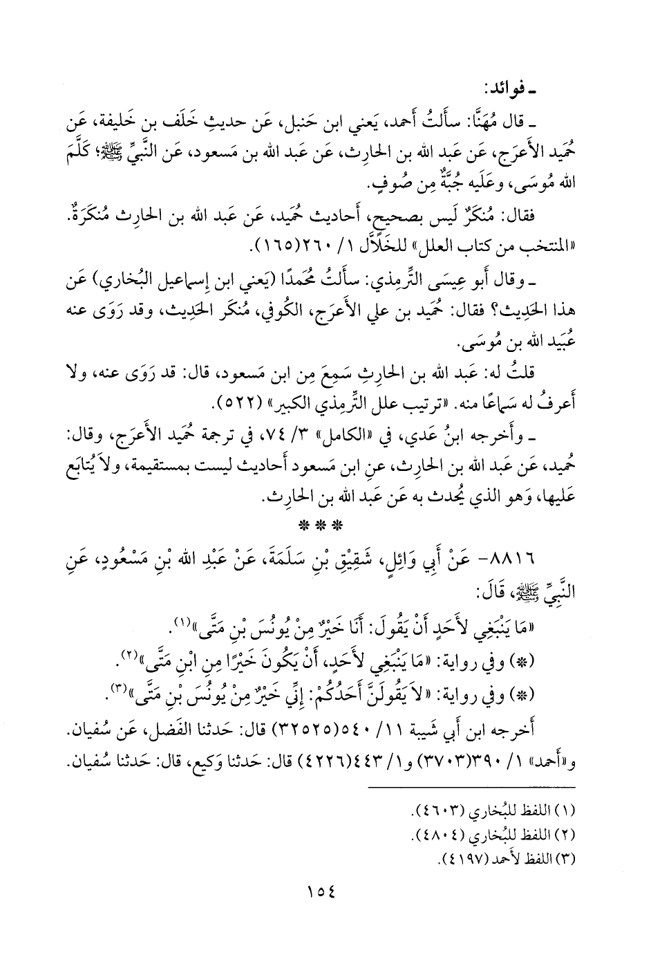 - قال مهنا: سألت أحمد، يعني ابن حنبل، عن حديث خلف بن خليفة، عن حميد الأعرج، عن عبد الله بن الحارث، عن عبد الله بن مسعود، عن النبي صَلى الله عَليه وسَلم؛ كلم الله موسى، وعليه جبة من صوف.