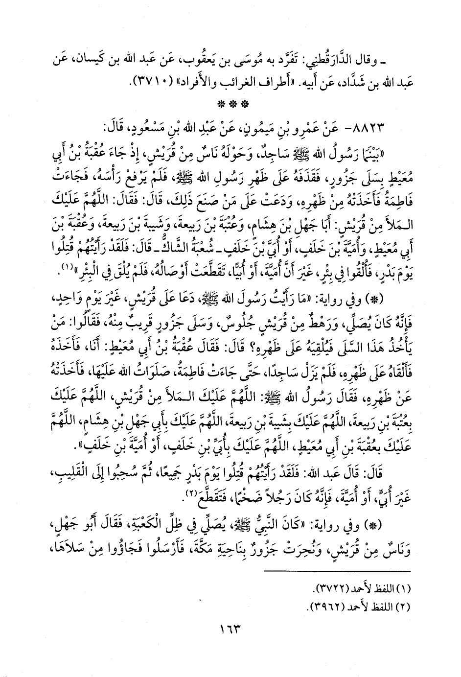 - وفي رواية: «كان النبي صَلى الله عَليه وسَلم يصلي في ظل الكعبة، فقال أَبو جهل، وناس من قريش، ونحرت جزور بناحية مكة، فأرسلوا فجاؤوا من سلاها،