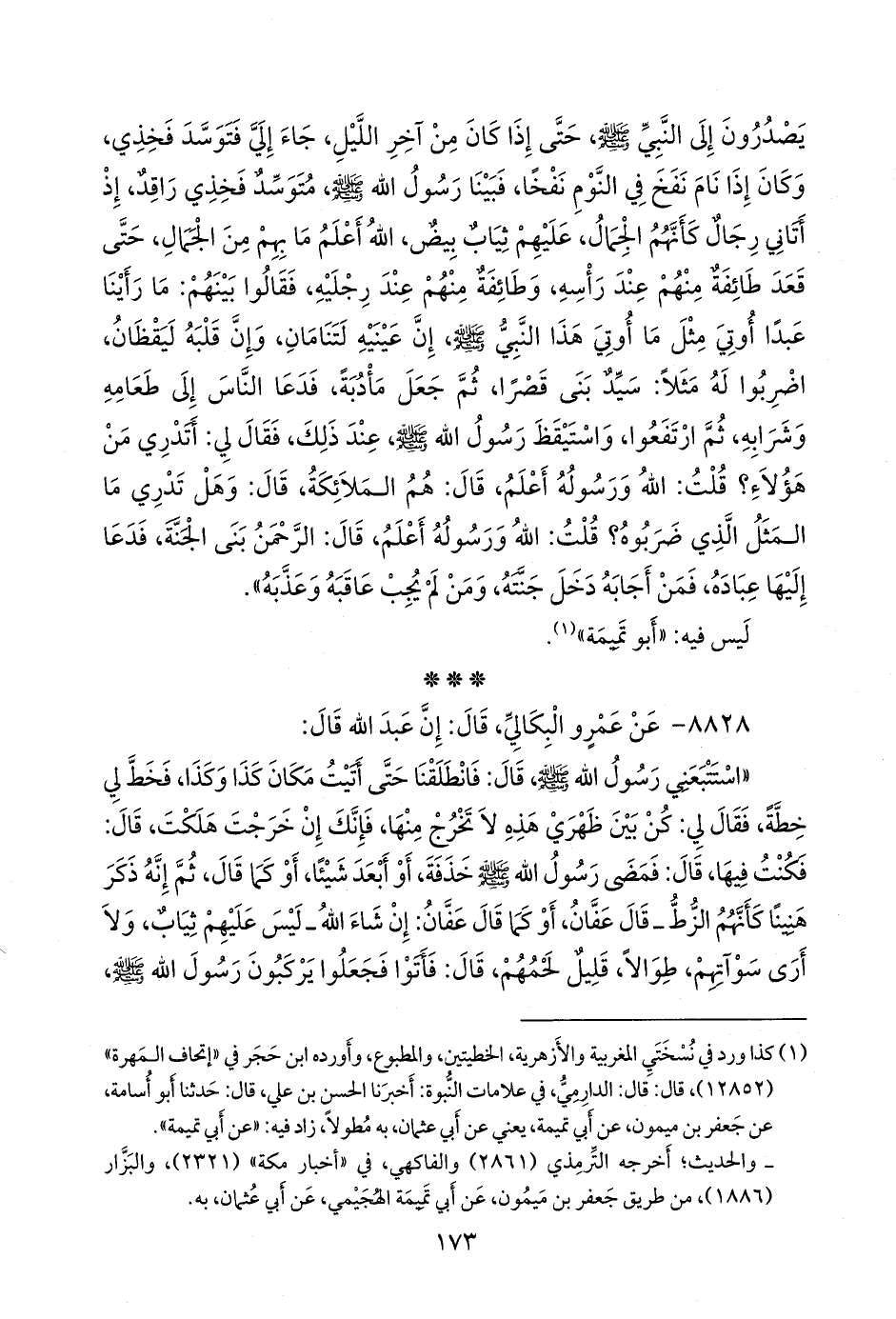 (¬١) كذا ورد في نسختي المغربية والأزهرية، الخطيتين، والمطبوع، وأورده ابن حجر في «إتحاف المهرة» (١٢٨٥٢)، قال: قال: الدَّارِمي، في علامات النبوة: أخبرنا الحسن بن علي، قال: حدثنا أَبو أُسامة، عن جعفر بن ميمون، عن أبي تميمة، يعني عن أبي عثمان، به مطولا، زاد فيه: «عن أبي تميمة».