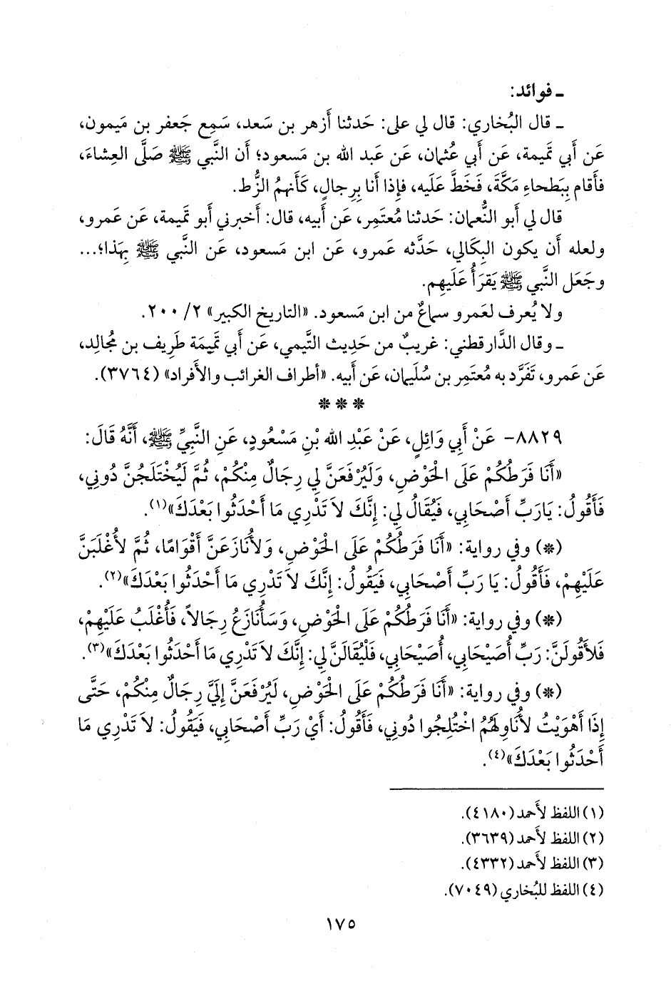 - وفي رواية: «أنا فرطكم على الحوض، ليرفعن إلي رجال منكم، حتى إذا أهويت لأناولهم اختلجوا دوني، فأقول: أي رب أصحابي، يقول: لا تدري ما أحدثوا بعدك» (¬٤).