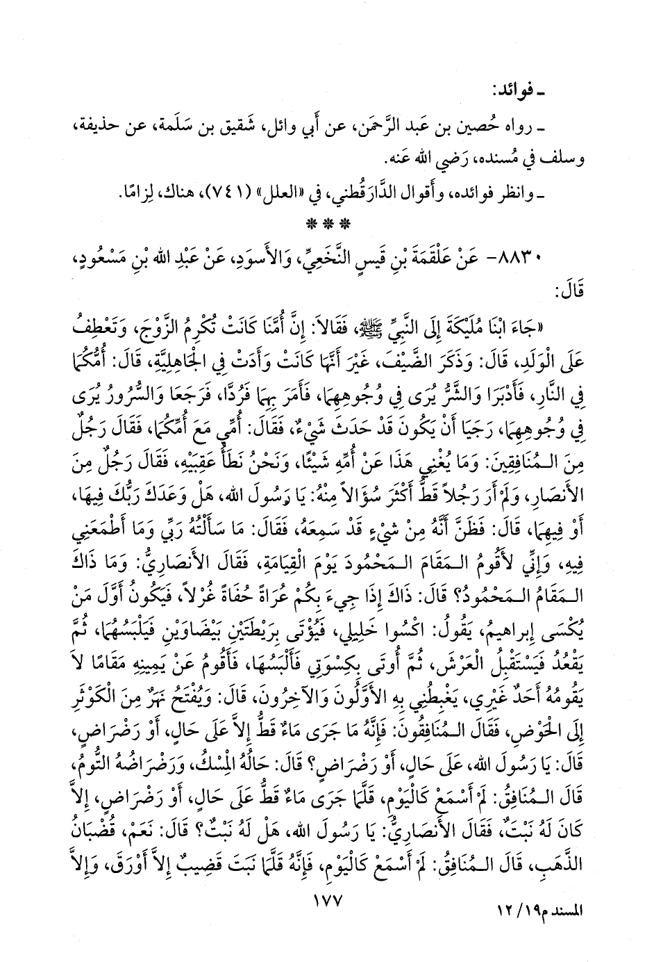 «جاء ابنا مليكة إلى النبي صَلى الله عَليه وسَلم فقالا: إن أمنا كانت تكرم الزوج، وتعطف على الولد, قال: وذكر الضيف, غير أنها كانت وأدت في الجاهلية، قال: أمكما في النار، فأدبرا والشر يرى في وجوههما، فأمر بهما فردا، فرجعا والسرور يرى في وجوههما، رجيا أن يكون قد حدث شيء، فقال: أمي مع أمكما, فقال رجل من المنافقين: وما يغني هذا عن أمه شيئا، ونحن نطأ عقبيه، فقال رجل من الأنصار، ولم أر رجلا قط أكثر سؤالا منه: يا رسول الله، هل وعدك ربك فيها، أو فيهما، قال: فظن أنه من شيء قد سمعه، فقال: ما سألته ربي وما أطمعني فيه، وإني لأقوم المقام المحمود يوم القيامة, فقال الأَنصاري: وما ذاك المقام المحمود؟ قال: ذاك إذا جيء بكم عراة حفاة غرلا, فيكون أول من يكسى إبراهيم, يقول: اكسوا خليلي, فيؤتى بريطتين بيضاوين فيلبسهما, ثم يقعد فيستقبل العرش, ثم أوتى بكسوتي فألبسها, فأقوم عن يمينه مقاما لا يقومه أحد غيري, يغبطني به الأولون والآخرون, قال: ويفتح نهر من الكوثر إلى الحوض, فقال المنافقون: فإنه ما جرى ماء قط إلا على حال، أو رضراض, قال: يا رسول الله, على حال، أو رضراض؟ قال: حاله المسك, ورضراضه التوم, قال المنافق: لم أسمع كاليوم، قلما جرى ماء قط على حال، أو رضراض، إلا كان له نبت, فقال الأَنصاري: يا رسول الله, هل له نبت؟ قال: نعم, قضبان الذهب, قال المنافق: لم أسمع كاليوم, فإنه قلما نبت قضيب إلا أورق, وإلا