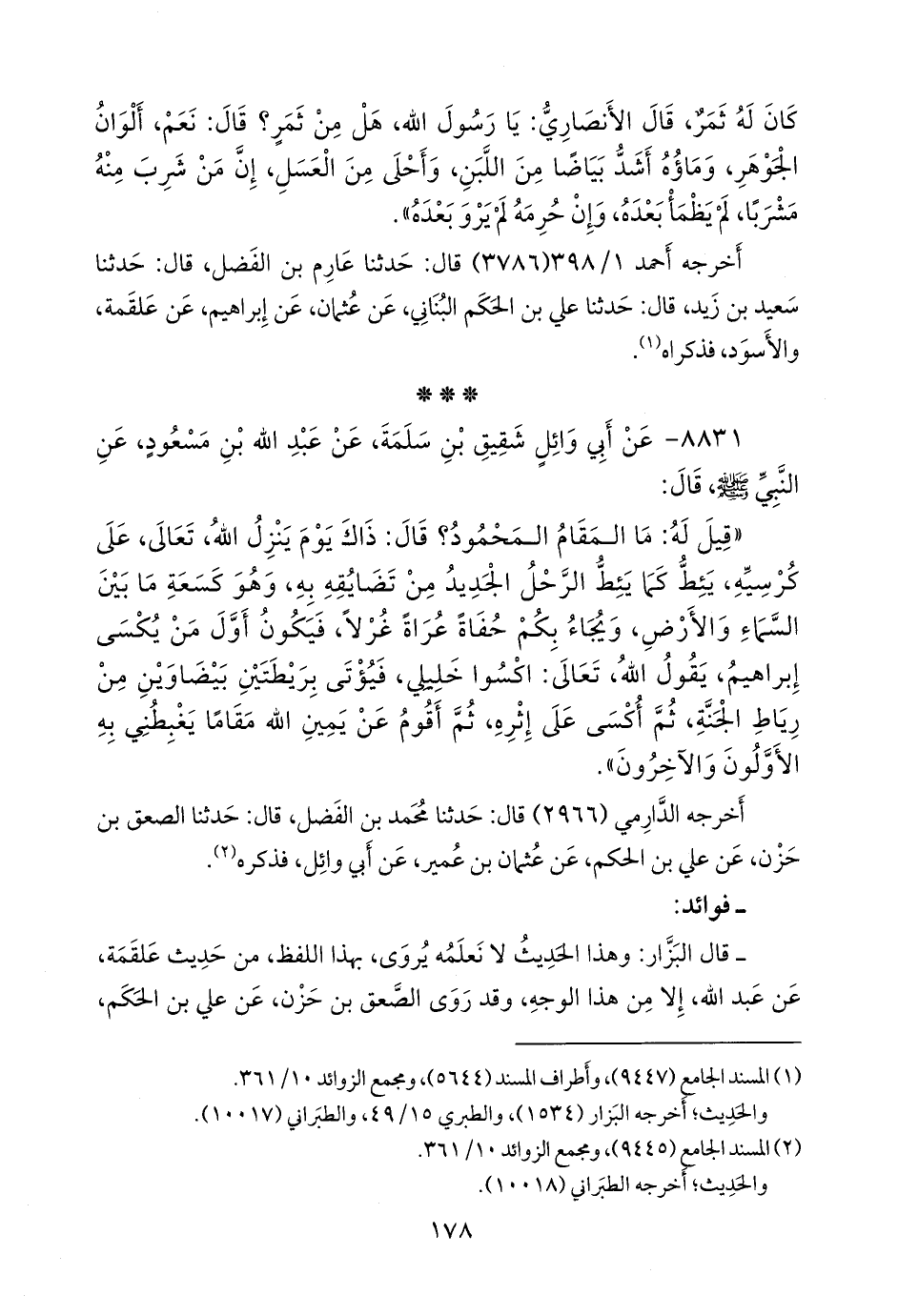 «قيل له: ما المقام المحمود؟ قال: ذاك يوم ينزل الله، تعالى، على كرسيه، يئط كما يئط الرحل الجديد من تضايقه به, وهو كسعة ما بين السماء والأرض, ويجاء بكم حفاة عراة غرلا, فيكون أول من يكسى إبراهيم, يقول الله، تعالى: اكسوا خليلي، فيؤتى بريطتين بيضاوين من رياط الجنة, ثم أكسى على إثره, ثم أقوم عن يمين الله مقاما يغبطني به الأولون والآخرون».