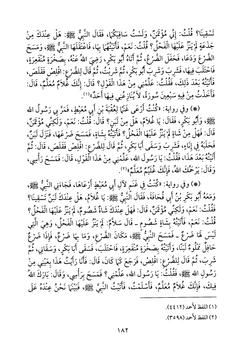 - وفي رواية: «كنت في غنم لآل أبي معيط أرعاها، فجاءني النبي صَلى الله عَليه وسَلم ومعه أَبو بكر بن أبي قحافة، فقال النبي صَلى الله عَليه وسَلم: يا غلام، هل عندك لبن تسقينا؟ فقلت: نعم، ولكني مؤتمن، قال: فهل عندك شاة شصوص، لم ينز عليها الفحل؟ قلت: نعم، فأتيته بشاة شصوص (قال سلام: لم ينز عليها الفحل، وهي التي ليس لها ضرع) فمسح النبي صَلى الله عَليه وسَلم مكان الضرع، وما بها ضرع، فإذا ضرع حافل مملوء لبنا، وأتيته بصخرة منقعرة، فاحتلب، فسقى أبا بكر، وسقاني، ثم شرب، ثم قال للضرع: اقلص، فرجع كما كان، قال: فأنا رأيت هذا بعيني من رسول الله صَلى الله عَليه وسَلم فقلت: يا رسول الله، علمني؟ فمسح برأسي، وقال: بارك الله فيك، فإنك غلام معلم، فأسلمت، فأتيت النبي صَلى الله عَليه وسَلم فبينما نحن عنده على