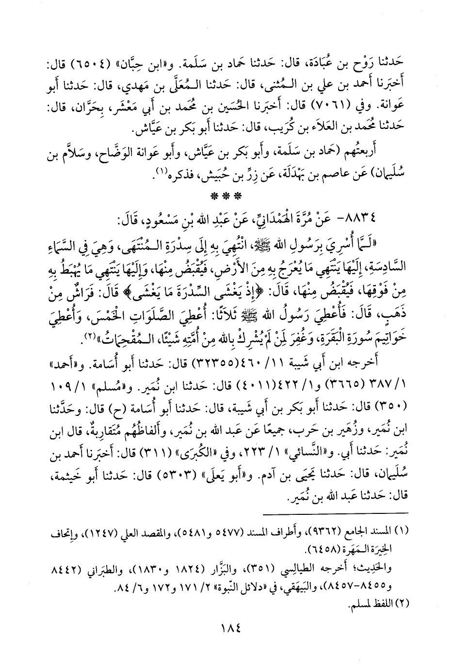 أخرجه ابن أبي شيبة (٣٢٣٥٥) قال: حدثنا أَبو أُسامة. و «أحمد» (٣٦٦٥) و ١/ ٤٢٢ (٤٠١١) قال: حدثنا ابن نُمير. و «مسلم» ١/ ١٠٩ (٣٥٠) قال: حدثنا أَبو بكر بن أبي شيبة، قال: حدثنا أَبو أُسامة (ح) قال: وحدثنا ابن نُمير، وزهير بن حرب، جميعا عن عبد الله بن نُمير، وألفاظهم متقاربة، قال ابن نُمير: حدثنا أبي. و «النَّسَائي» ١/ ٢٢٣، وفي «الكبرى» (٣١١) قال: أخبرنا أحمد بن سليمان، قال: حدثنا يحيى بن آدم. و «أَبو يَعلى» (٥٣٠٣) قال: حدثنا أَبو خيثمة، قال: حدثنا عبد الله بن نُمير.