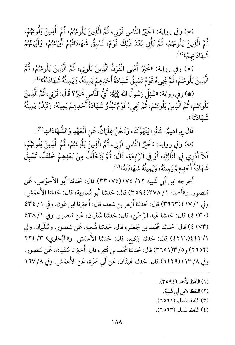 (٦٦٥٨) قال: حدثنا سعد بن حفص، قال: حدثنا شَيبان، عن منصور. و «مسلم» ٧/ ١٨٤ (٦٥٦٠) قال: حدثنا قتيبة بن سعيد، وهناد بن السَّري، قالا: حدثنا أَبو الأحوص، عن منصور. وفي (٦٥٦١) قال: حدثنا عثمان بن أبي شيبة، وإسحاق بن إبراهيم الحنظلي، قال إسحاق: أخبرنا، وقال عثمان: حدثنا جرير، عن منصور. وفي ٧/ ١٨٥ (٦٥٦٢) قال: وحدثنا محمد بن المثنى، وابن بشار، قالا: حدثنا محمد بن جعفر، قال: حدثنا شعبة (ح) قال: وحدثنا محمد بن المثنى، وابن بشار، قالا: حدثنا عبد الرَّحمَن، قال: حدثنا سفيان، كلاهما عن منصور. وفي (٦٥٦٣) قال: وحدثني الحسن بن علي الحُلْواني، قال: حدثنا أزهر بن سعد السمان، عن ابن عون. و «ابن ماجة» (٢٣٦٢) قال: حدثنا عثمان بن أبي شيبة، وعَمرو بن رافع، قالا: حدثنا جرير، عن منصور. و «التِّرمِذي» (٣٨٥٩) قال: حدثني هَنَّاد، قال: حدثنا أَبو معاوية، عن الأعمش. و «النَّسَائي» في «الكبرى» (٥٩٨٧) قال: أخبرنا إسحاق بن إبراهيم، قال: أخبرنا جرير، عن منصور. وفي (٥٩٨٨/ ١) قال: أخبرنا أحمد بن عثمان، قال: حدثنا أزهر، قال: حدثنا ابن عون.