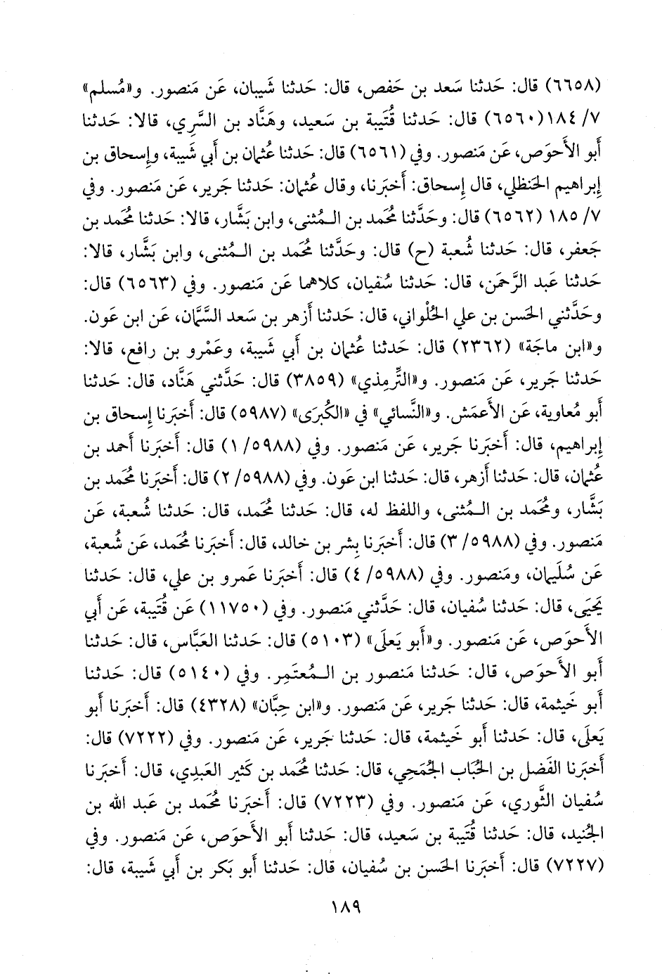 وفي (٥٩٨٨/ ٢) قال: أخبرنا محمد بن بشار، ومحمد بن المثنى، واللفظ له, قال: حدثنا محمد، قال: حدثنا شعبة، عن منصور. وفي (٥٩٨٨/ ٣) قال: أخبرنا بشر بن خالد، قال: أخبرنا محمد، عن شعبة، عن سليمان، ومنصور. وفي (٥٩٨٨/ ٤) قال: أخبرنا عَمرو بن علي، قال: حدثنا يحيى، قال: حدثنا سفيان، قال: حدثني منصور. وفي (١١٧٥٠) عن قتيبة، عن أبي الأحوص، عن منصور. و «أَبو يَعلى» (٥١٠٣) قال: حدثنا العباس، قال: حدثنا أَبو الأحوص، قال: حدثنا منصور بن المُعتَمِر. وفي (٥١٤٠) قال: حدثنا أَبو خيثمة، قال: حدثنا جرير، عن منصور. و «ابن حِبَّان» (٤٣٢٨) قال: أخبرنا أَبو يَعلى، قال: حدثنا أَبو خيثمة، قال: حدثنا جرير، عن منصور. وفي (٧٢٢٢) قال: أخبرنا الفضل بن الحُبَاب الجُمحي، قال: حدثنا محمد بن كثير العبدي، قال: أخبرنا سفيان الثوري، عن منصور. وفي (٧٢٢٣) قال: أخبرنا محمد بن عبد الله بن الجنيد، قال: حدثنا قتيبة بن سعيد، قال: حدثنا أَبو الأحوص، عن منصور. وفي (٧٢٢٧) قال: أخبرنا الحسن بن سفيان، قال: حدثنا أَبو بكر بن أبي شيبة، قال: