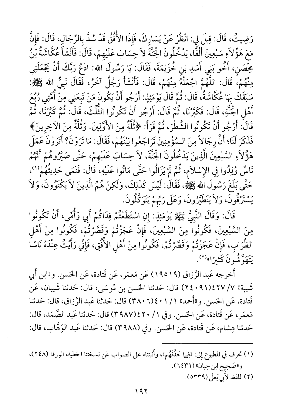 أخبرنا هشام، عن قتادة، عن الحسن (ح) قال: وحدثنا عن سعيد، عن قتادة، عن الحسن. وفي ١/ ٤٢٠ (٣٩٨٩) و ١/ ٤٢١ (٤٠٠٠) قال: حدثنا محمد بن بكر، قال: أخبرنا سعيد، عن قتادة، عن الحسن، والعلاء بن زياد. و «أَبو يَعلى» (٥٣٣٩) قال: حدثنا أَبو خيثمة (¬٢)، قال: حدثنا الحسن بن موسى، قال: حدثنا شَيبان، عن قتادة، عن الحسن. و «ابن حِبَّان» (٦٤٣١) قال: أخبرنا عمران بن موسى بن مجاشع السَّخْتِياني، قال: حدثنا محمد بن المثنى، قال: حدثنا ابن أَبي عَدي، عن سعيد، عن قتادة، عن الحسن، والعلاء بن زياد. وفي (٧٣٤٦) قال: أخبرنا عبد الله بن محمد الأزدي، قال: حدثنا إسحاق بن إبراهيم الحنظلي، قال: أخبرنا معاذ بن هشام، قال: حدثني أبي، عن قتادة، عن الحسن.