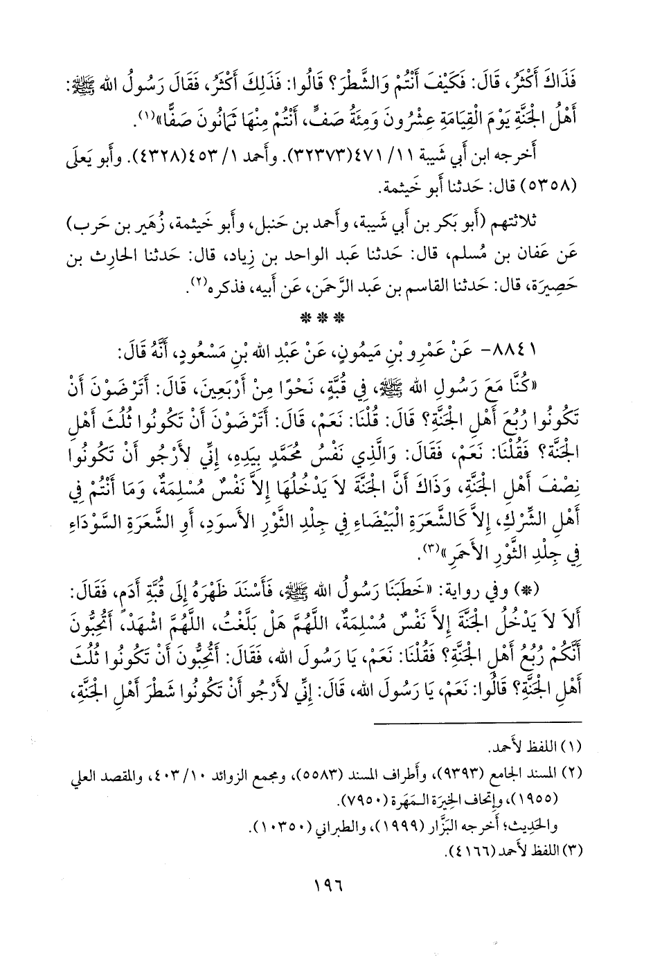 - وفي رواية: «قال لنا رسول الله صَلى الله عَليه وسَلم: أما ترضون أن تكونوا ربع أهل الجنة؟ قال: فكبرنا، ثم قال: أما ترضون أن تكونوا ثلث أهل الجنة؟ قال: فكبرنا، ثم قال: إني لأرجو أن تكونوا شطر أهل الجنة، وسأخبركم عن ذلك، ما المسلمون في الكفار، إلا كشعرة بيضاء في ثور أسود، أو كشعرة سوداء في ثور أبيض» (¬٣).