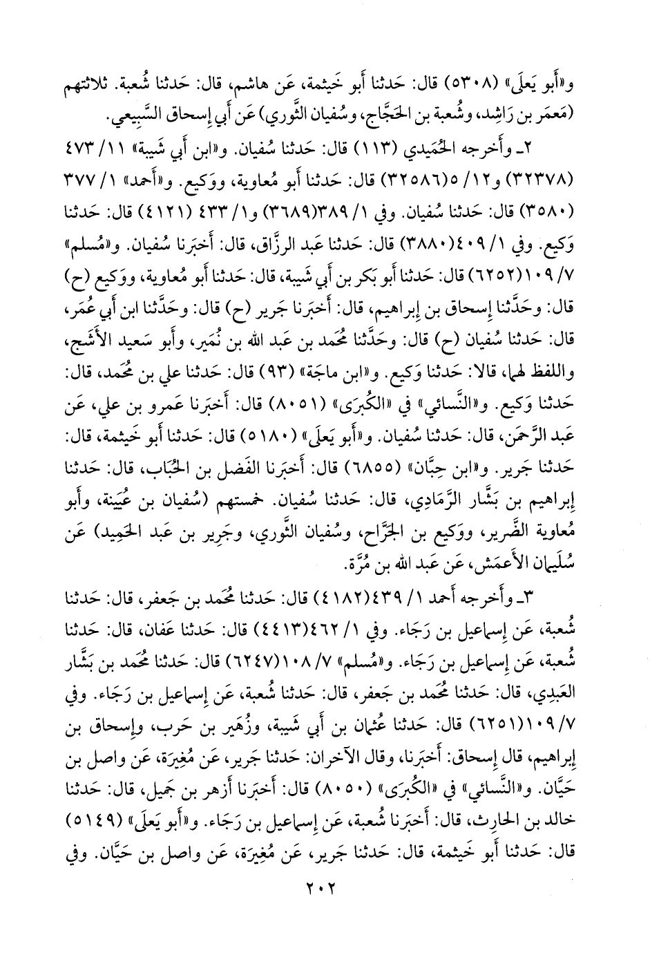 وفي ٧/ ١٠٩ (٦٢٥١) قال: حدثنا عثمان بن أبي شيبة، وزهير بن حرب، وإسحاق بن إبراهيم، قال إسحاق: أخبرنا، وقال الآخران: حدثنا جرير، عن مغيرة، عن واصل بن حيان. و «النَّسَائي» في «الكبرى» (٨٠٥٠) قال: أخبرنا أزهر بن جميل، قال: حدثنا خالد بن الحارث، قال: أخبرنا شعبة، عن إسماعيل بن رجاء. و «أَبو يَعلى» (٥١٤٩) قال: حدثنا أَبو خيثمة، قال: حدثنا جرير، عن مغيرة، عن واصل بن حيان. وفي