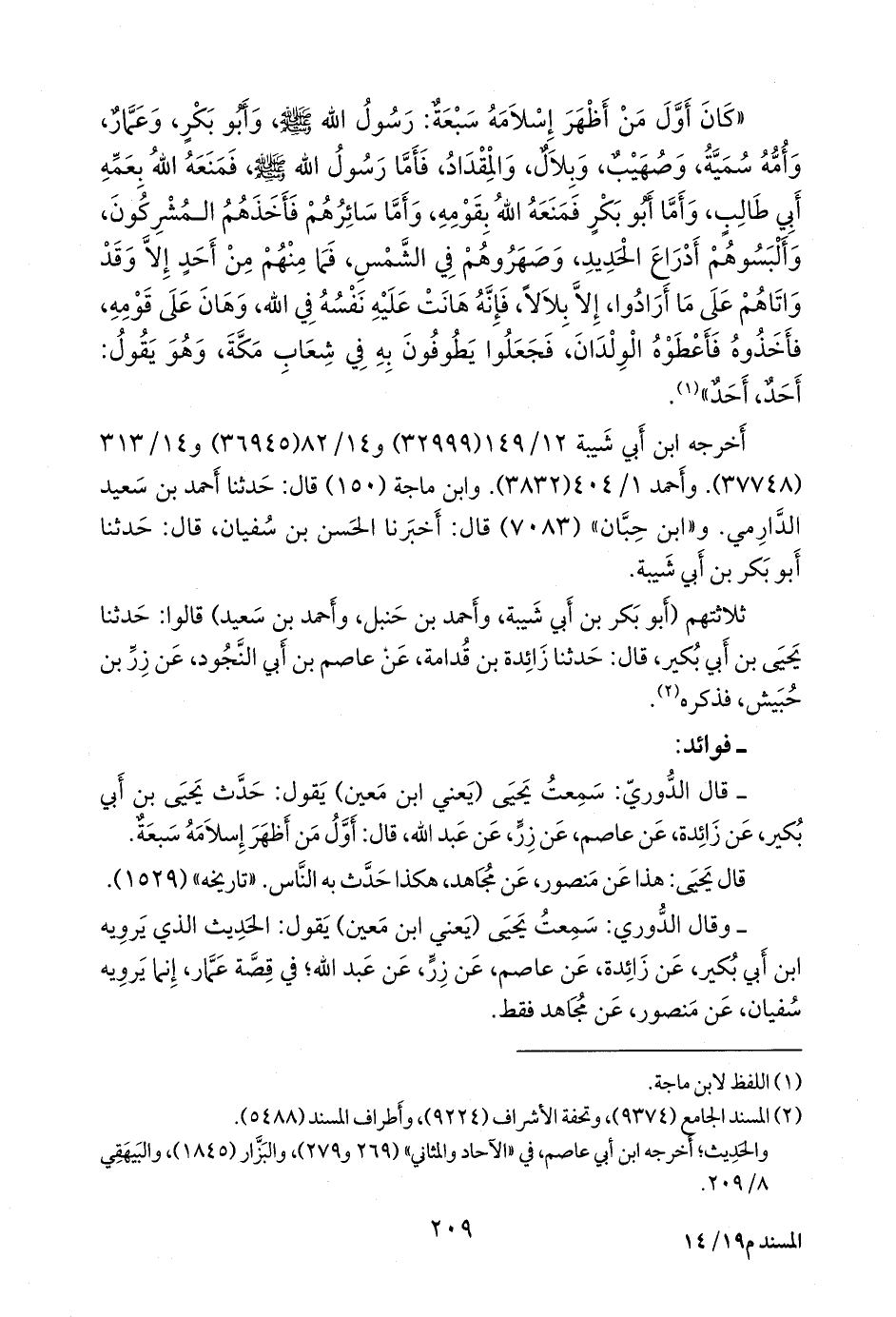 - قال عباس الدُّوري: سمعت يحيى، يعني ابن مَعين، يقول: حدث يحيى بن أبي بكير، عن زائدة، عن عاصم، عن زر، عن عبد الله، قال: أول من أظهر إسلامه سبعة.