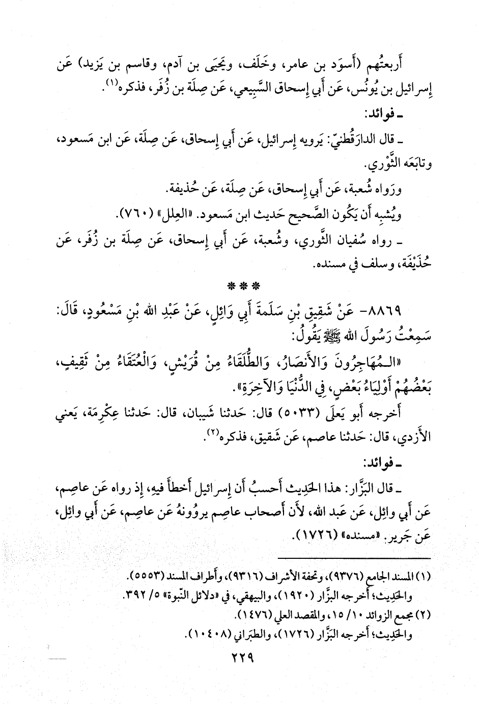 - وقال البزار: هذا الحديث أحسب أن إسرائيل أخطأ فيه، إذ رواه عن عاصم، عن أبي وائل، عن عبد الله، لأن أصحاب عاصم يروونه عن عاصم، عن أبي وائل، عن جرير. «مسنده» (١٧٢٦).