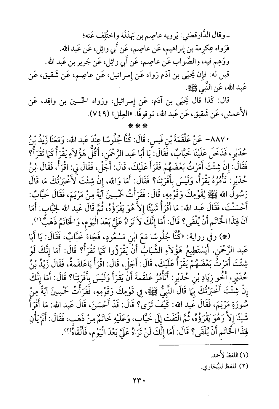 ٨٨٧٠ - عن علقمة بن قيس، قال: كنا جلوسا عند عبد الله، ومعنا زيد بن حدير، فدخل علينا خباب، فقال: يا أبا عبد الرَّحمَن، أكل هؤلاء يقرأ كما تقرأ؟ فقال: إن شئت أمرت بعضهم فقرأ عليك، قال: أجل، فقال لي: اقرأ، فقال ابن حدير: تأمره يقرأ، وليس بأقرئنا؟ فقال: أما والله، إن شئت لأخبرتك ما قال رسول الله صَلى الله عَليه وسَلم لقومك وقومه، قال: فقرأت خمسين آية من مريم، فقال خباب: أحسنت، فقال عبد الله: ما أقرأ شيئًا إلا هو يقرؤه، ثم قال عبد الله لخباب: أما آن لهذا الخاتم أن يلقى؟ قال: أما إنك لا تراه علي بعد اليوم، والخاتم ذهب (¬١).